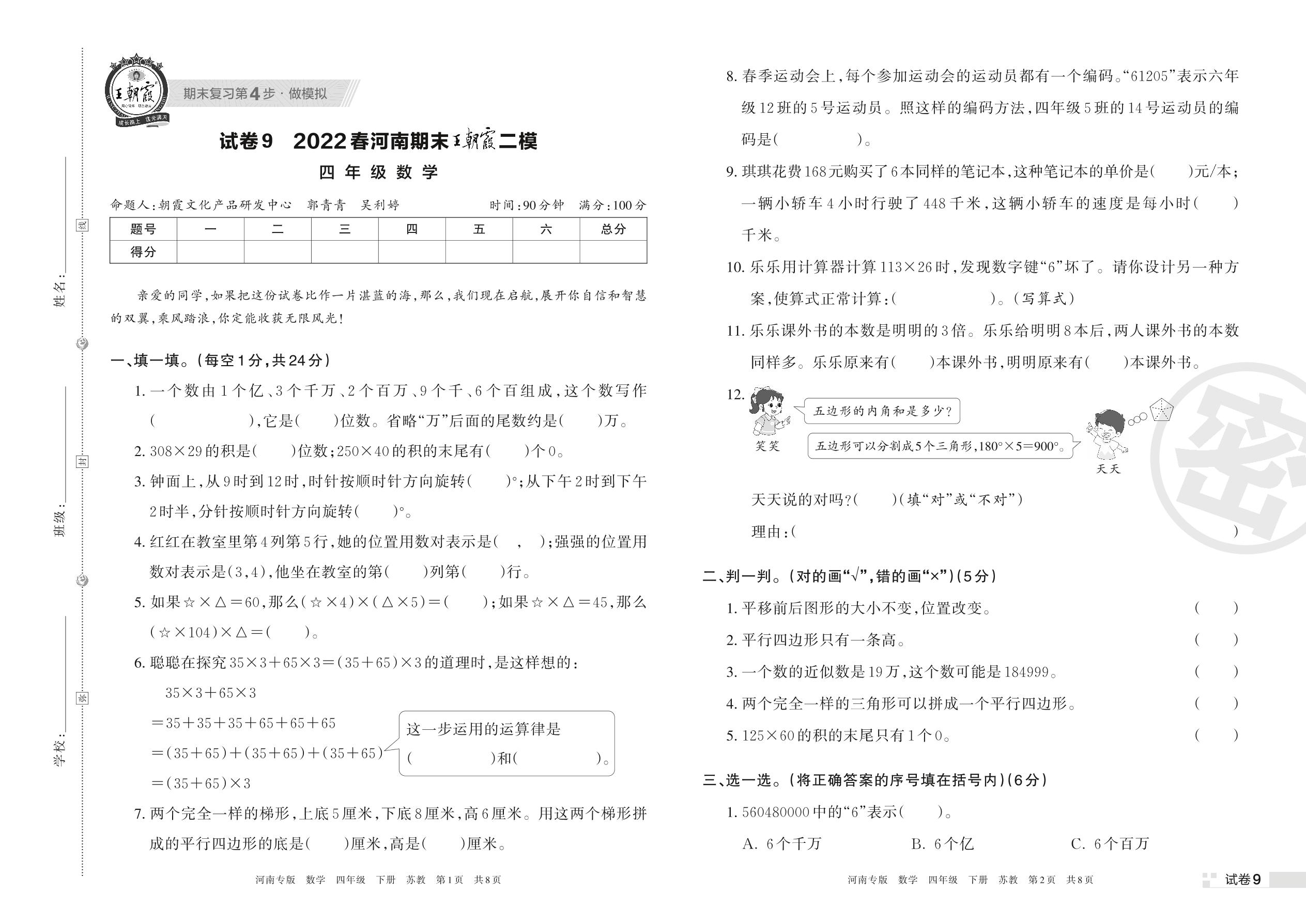 王朝霞期末模拟卷四年级下册数学(苏教版)【9】