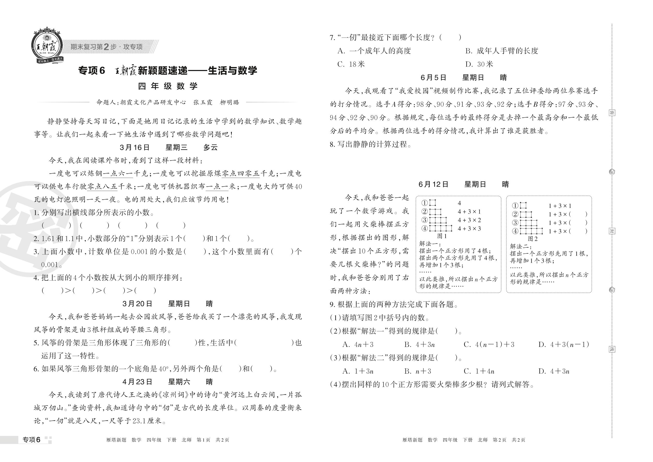 王朝霞期末专项卷——新颖题速递:生活与数学四年级下册数学(北师版)_R220329171309152【6】