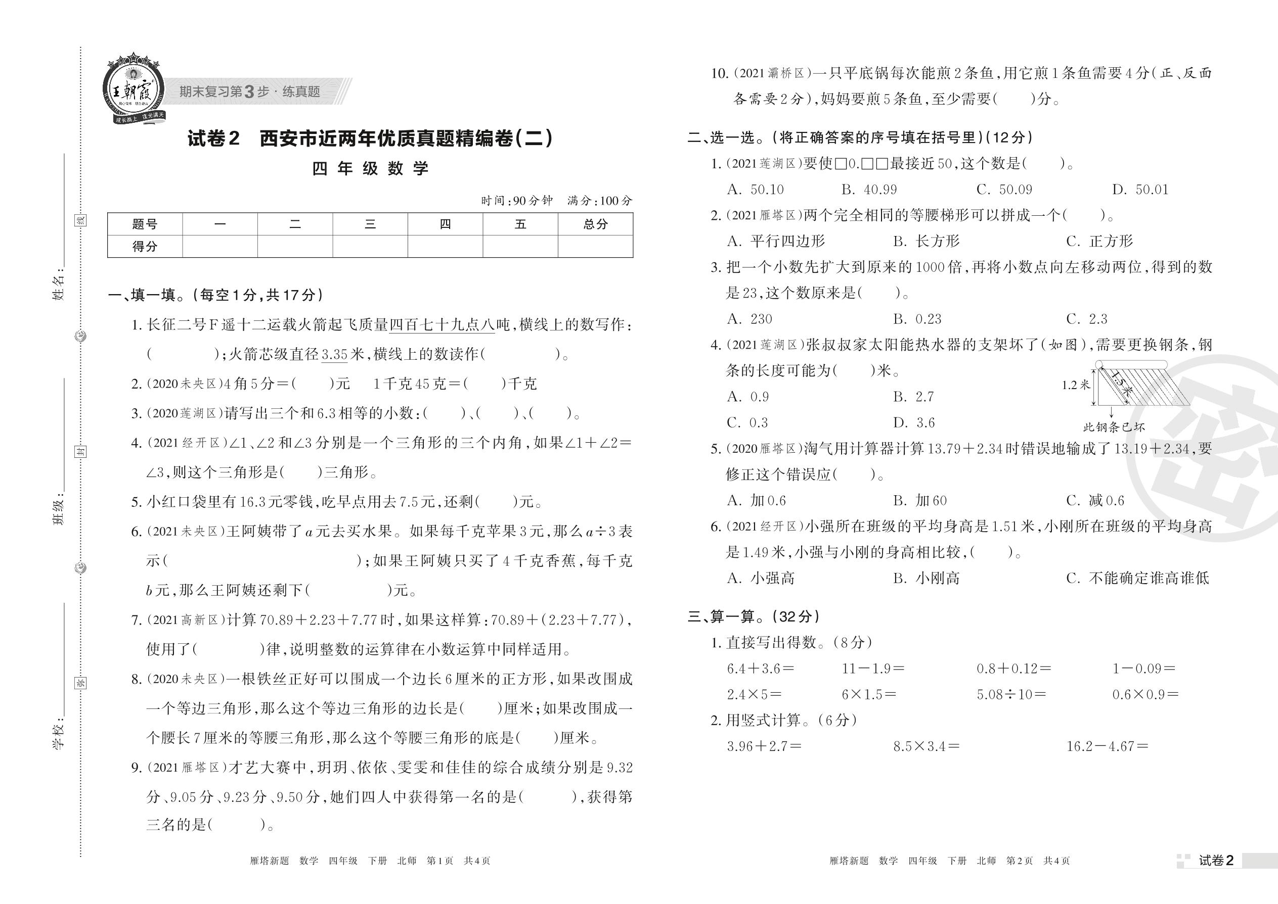 西安市近两年优质真题精编卷(二)四年级下册数学(北师版)【2】