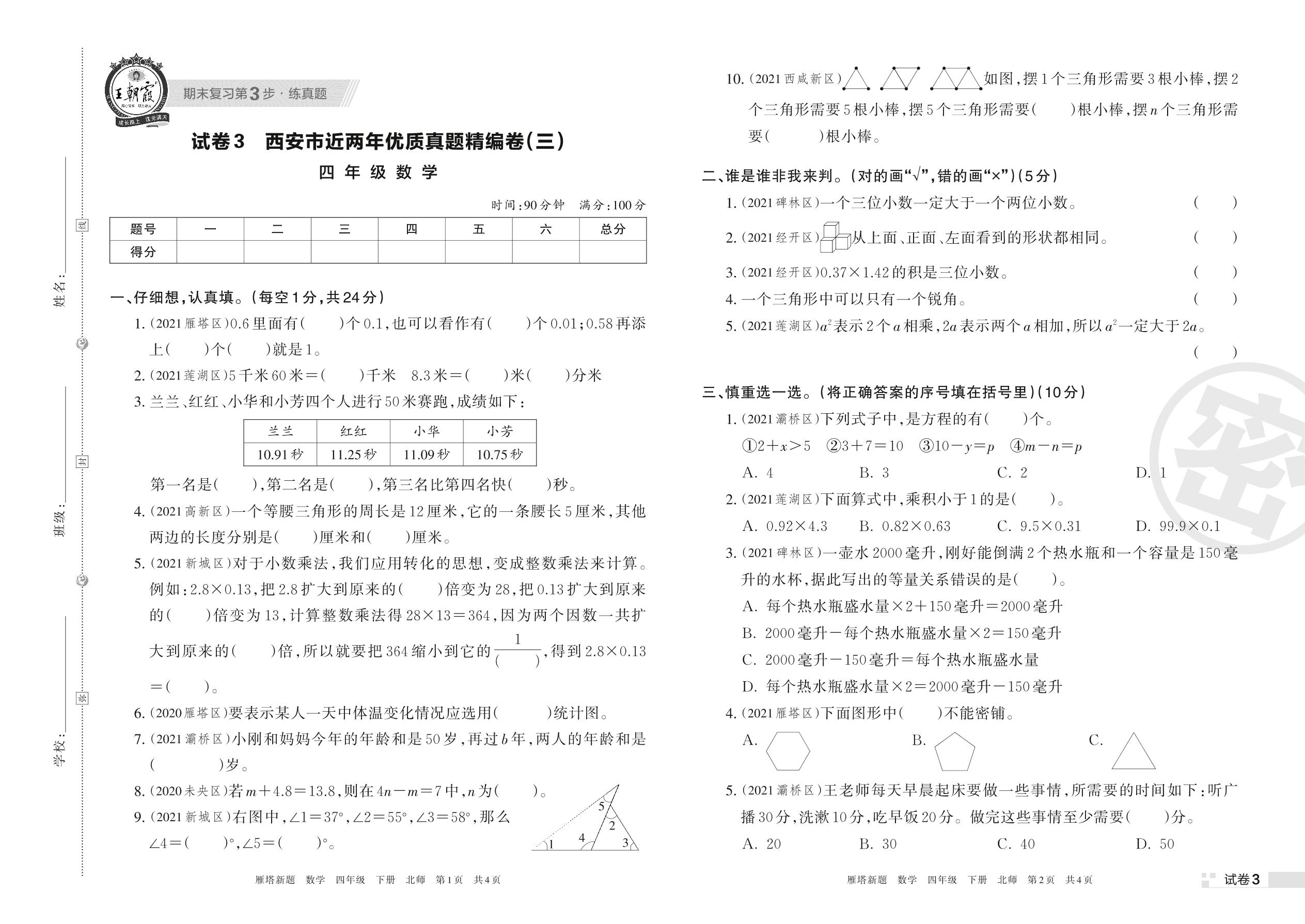 西安市近两年优质真题精编卷(三)四年级下册数学(北师版)【3】
