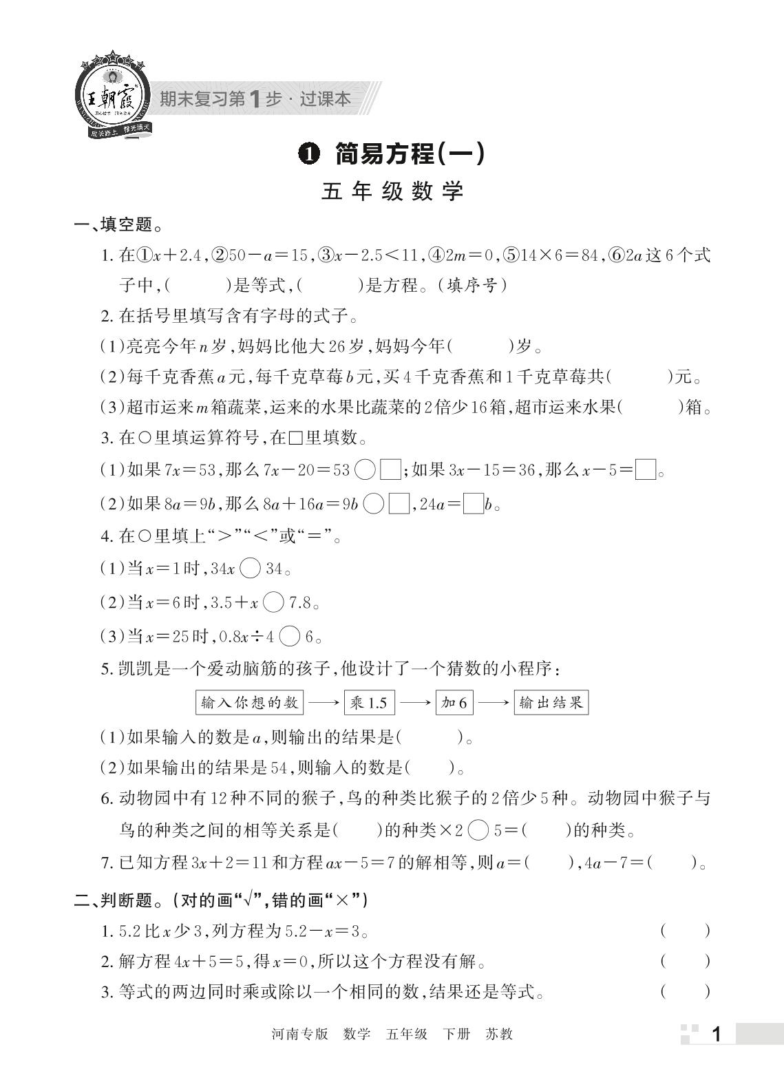 王朝霞期末过课本——1 简易方程(一)五年级下册数学(苏教版)_R220329171531305
