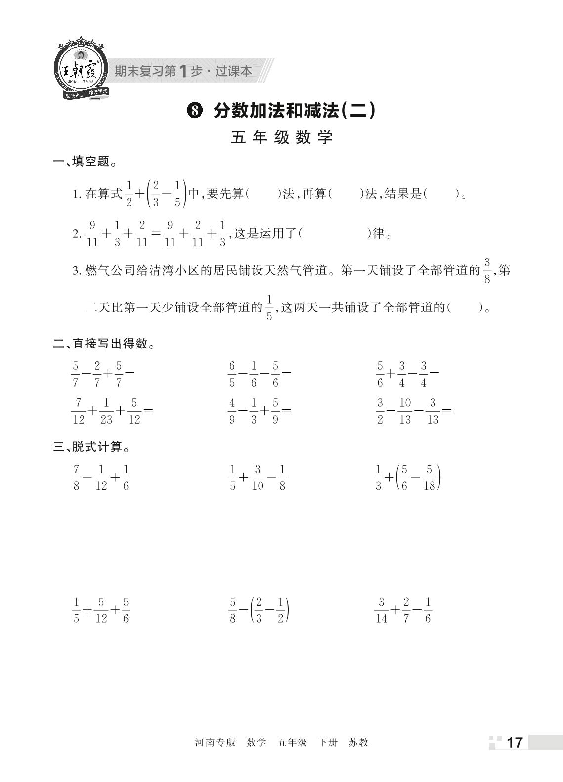 王朝霞期末过课本——8 分数加法和减法(二)五年级下册数学(苏教版)_R220329171531990