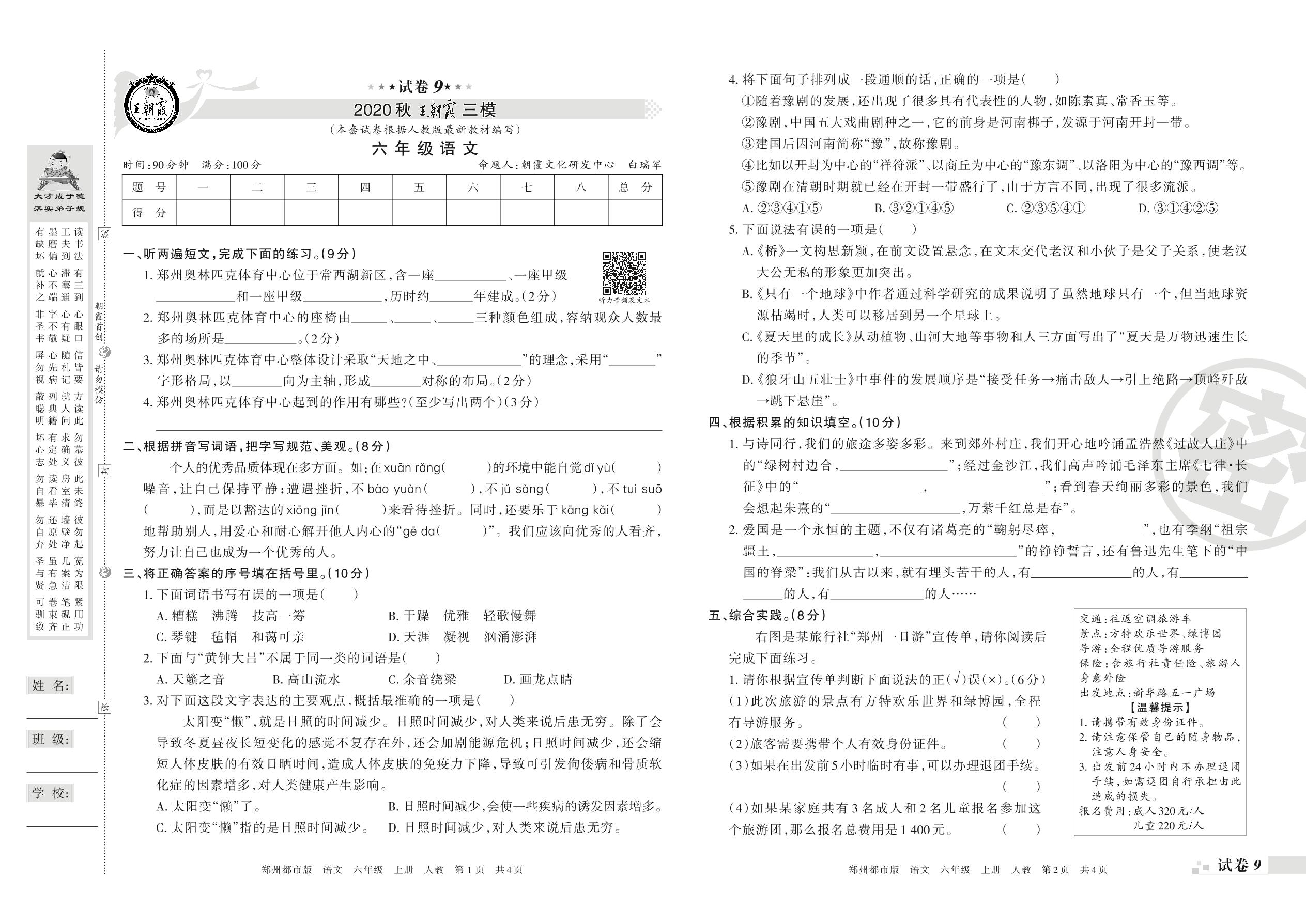 王朝霞期末模拟卷六年级上册语文(人教版)_R21080215255【9】