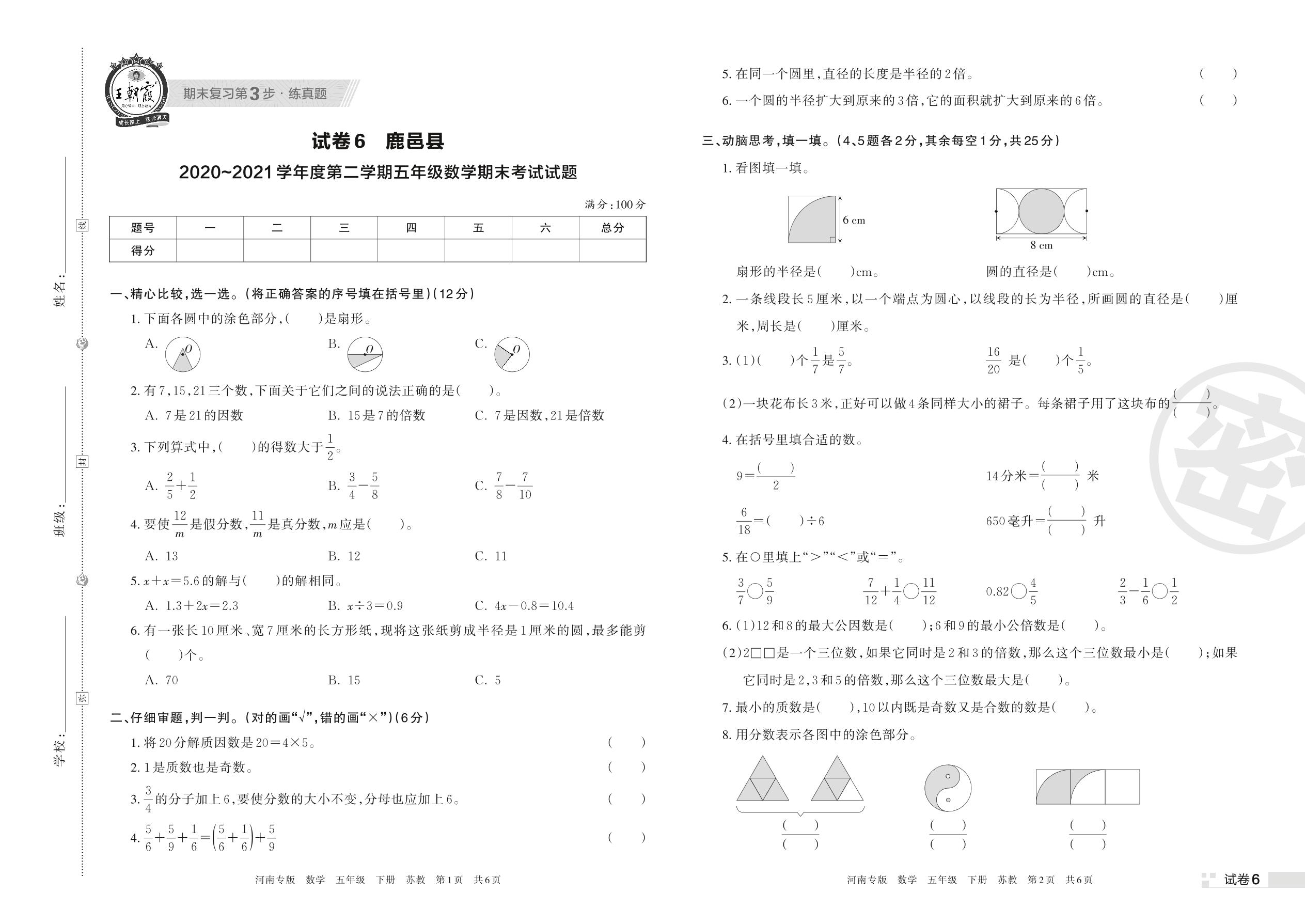 鹿邑县2020~2021学年度第二学期五年级数学期末考试试题(苏教版)【6】