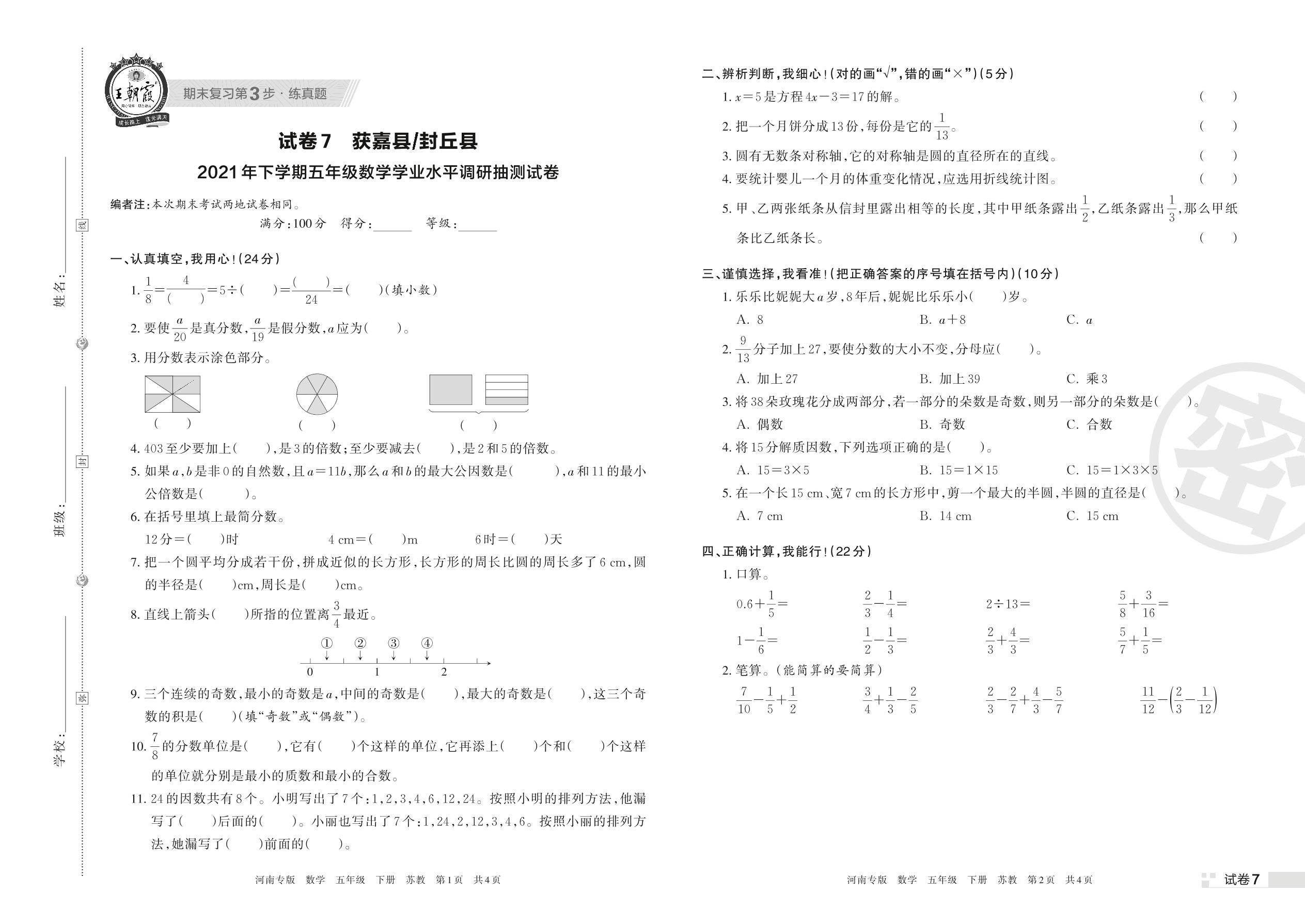 获嘉县、封丘县2021年下学期五年级数学学业水平调研抽测试卷(苏教版)【7】