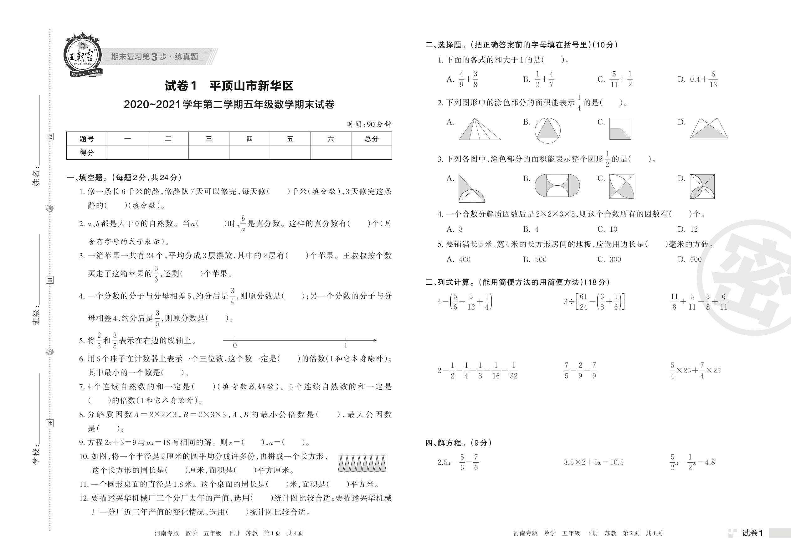 平顶山市新华区2020~2021学年第二学期五年级数学期末试卷(苏教版)【1】