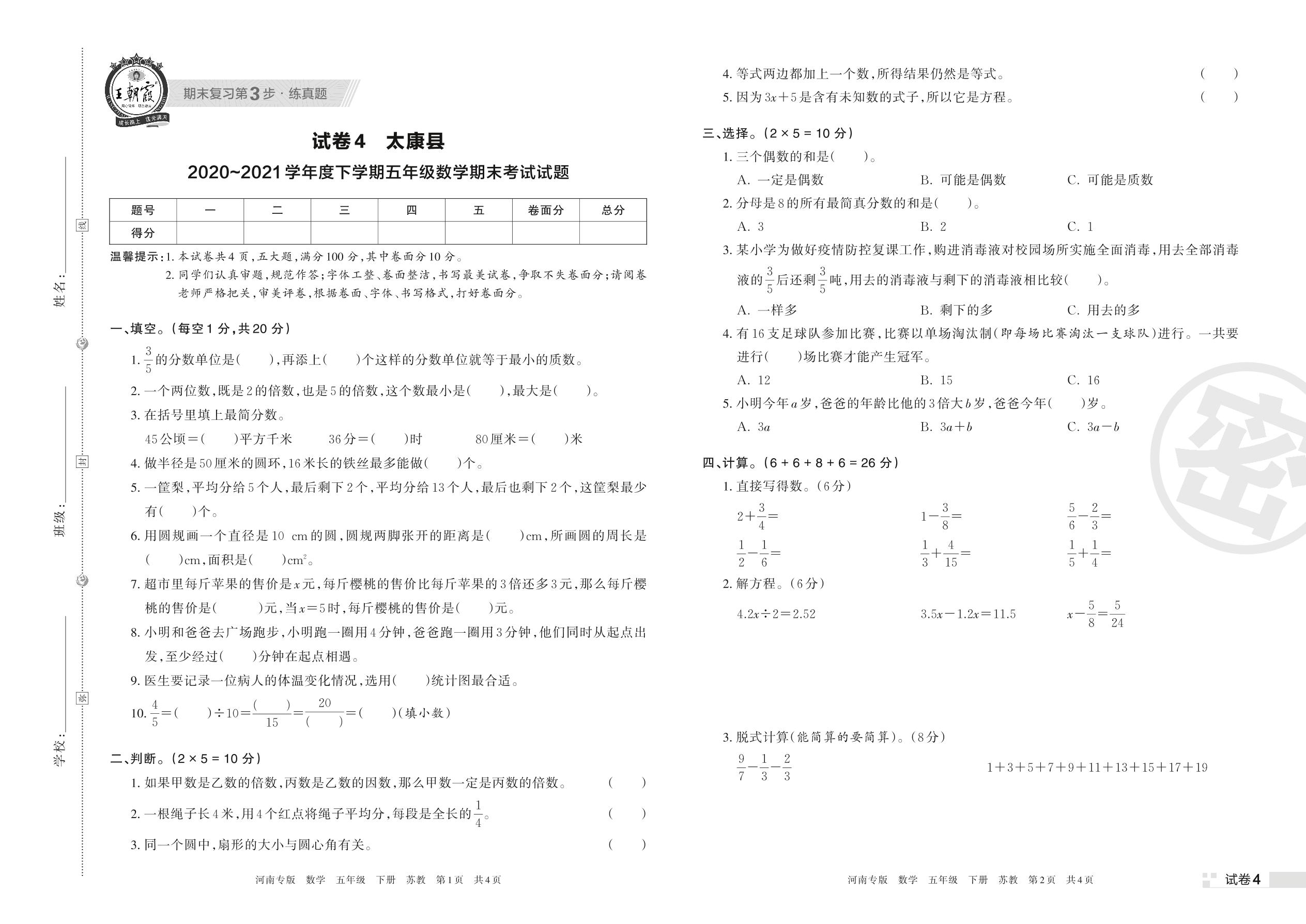 太康县2020~2021学年度下学期五年级数学期末考试试题(苏教版)【4】