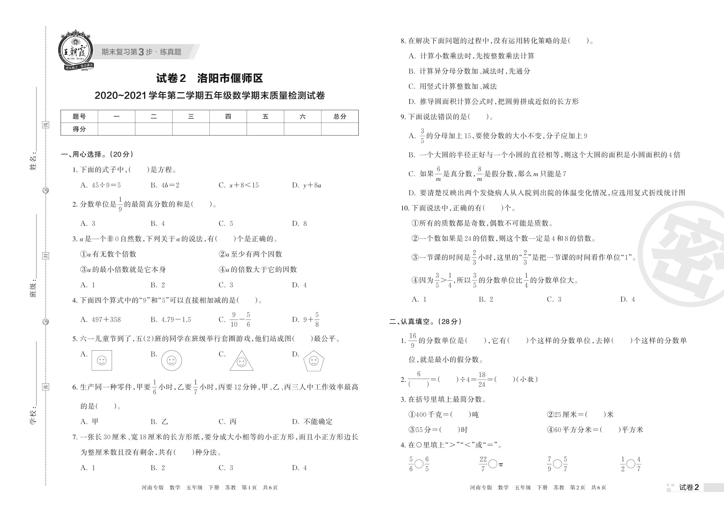 洛阳市偃师区2020~2021学年第二学期五年级数学期末质量检测试卷(苏教版)【2】