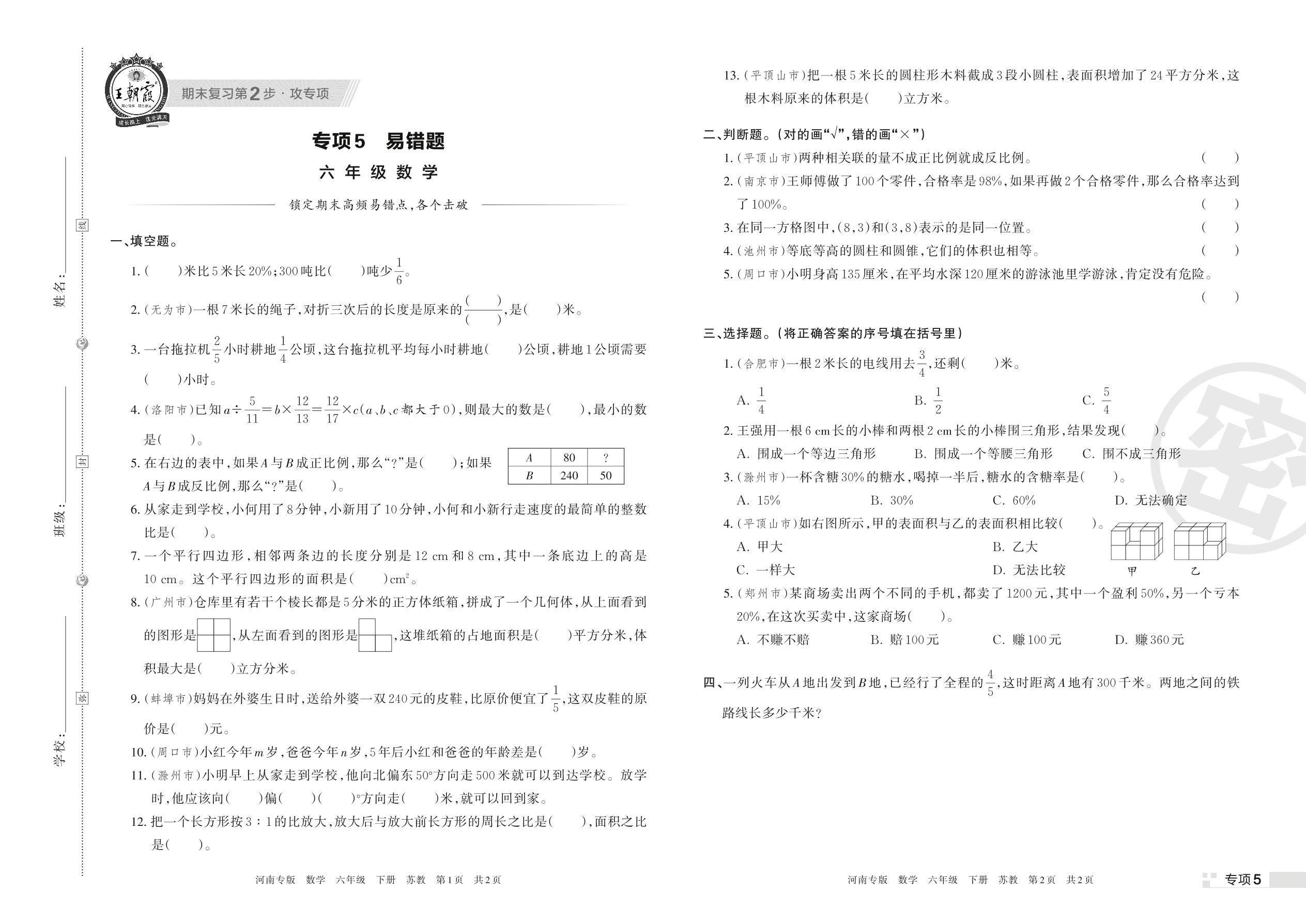 王朝霞期末专项卷——易错题六年级下册数学(苏教版)_R220329172225942【5】