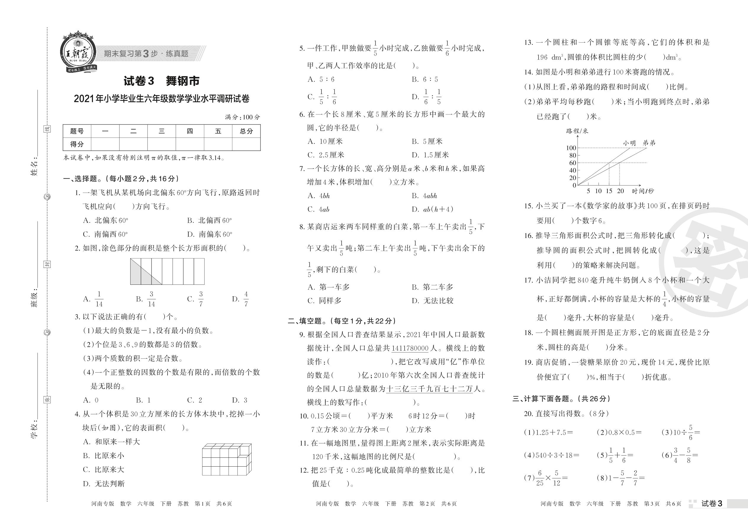 舞钢市2021年小学毕业生六年级数学学业水平调研试卷(苏教版)【3】