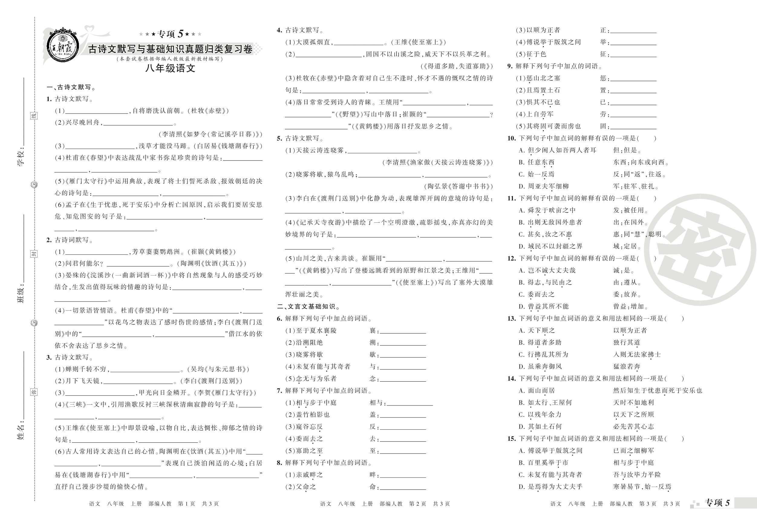 王朝霞期末专项卷——古诗文默写与基础知识、课内文言文阅读真题归类复习八年级上册语文(人教版)_R21080215317【0】