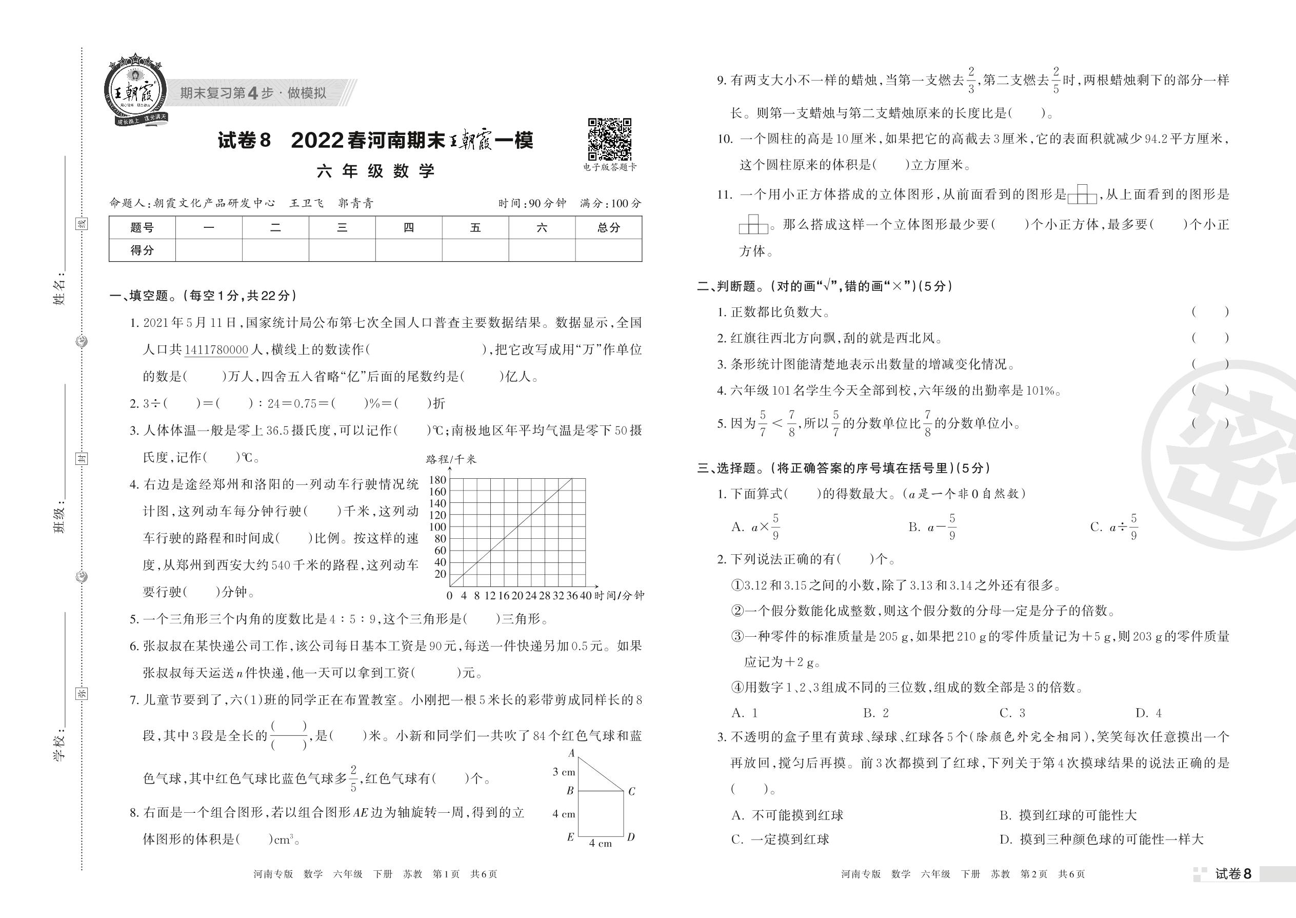 王朝霞期末模拟卷六年级下册数学(苏教版)【8】