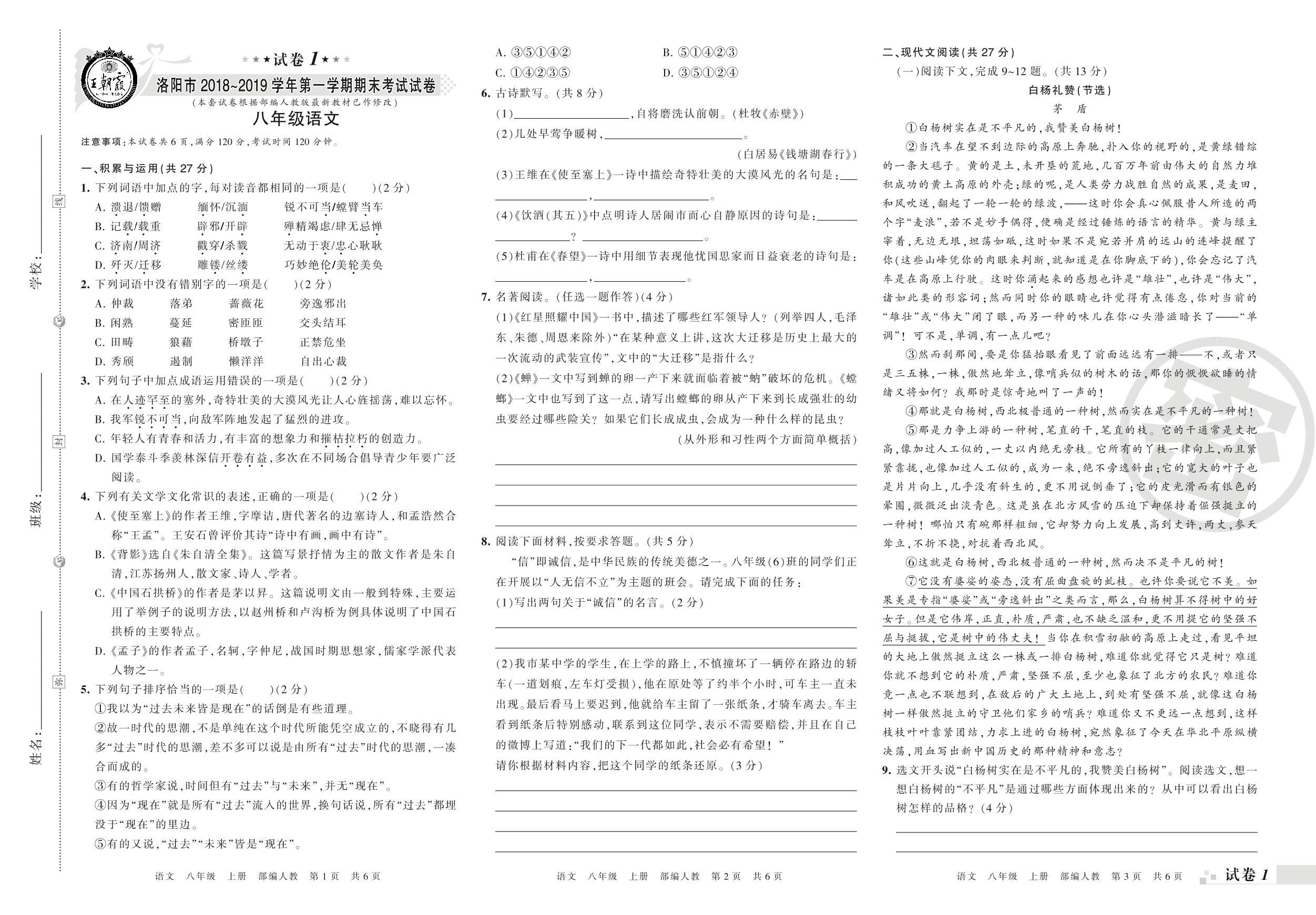 2018-2019学年第一学期洛阳市八年级语文试卷(人教版)【1】