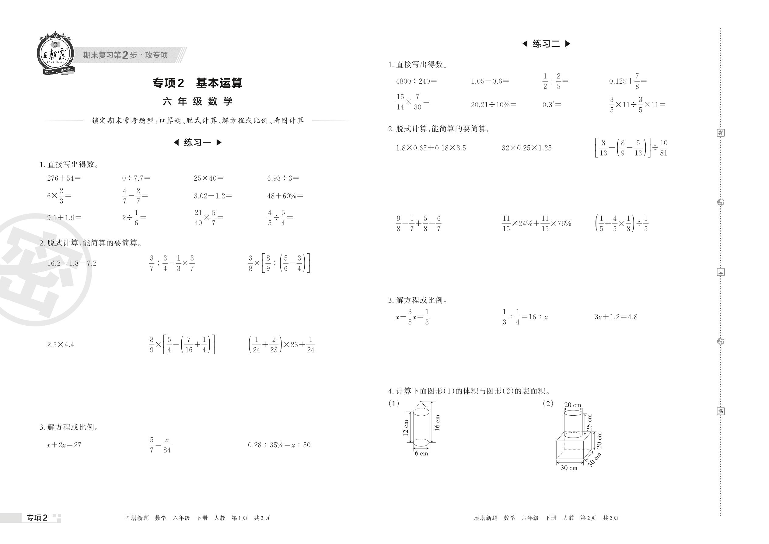 王朝霞期末专项卷——基本运算六年级下册数学(人教版)_R220330090345457【2】