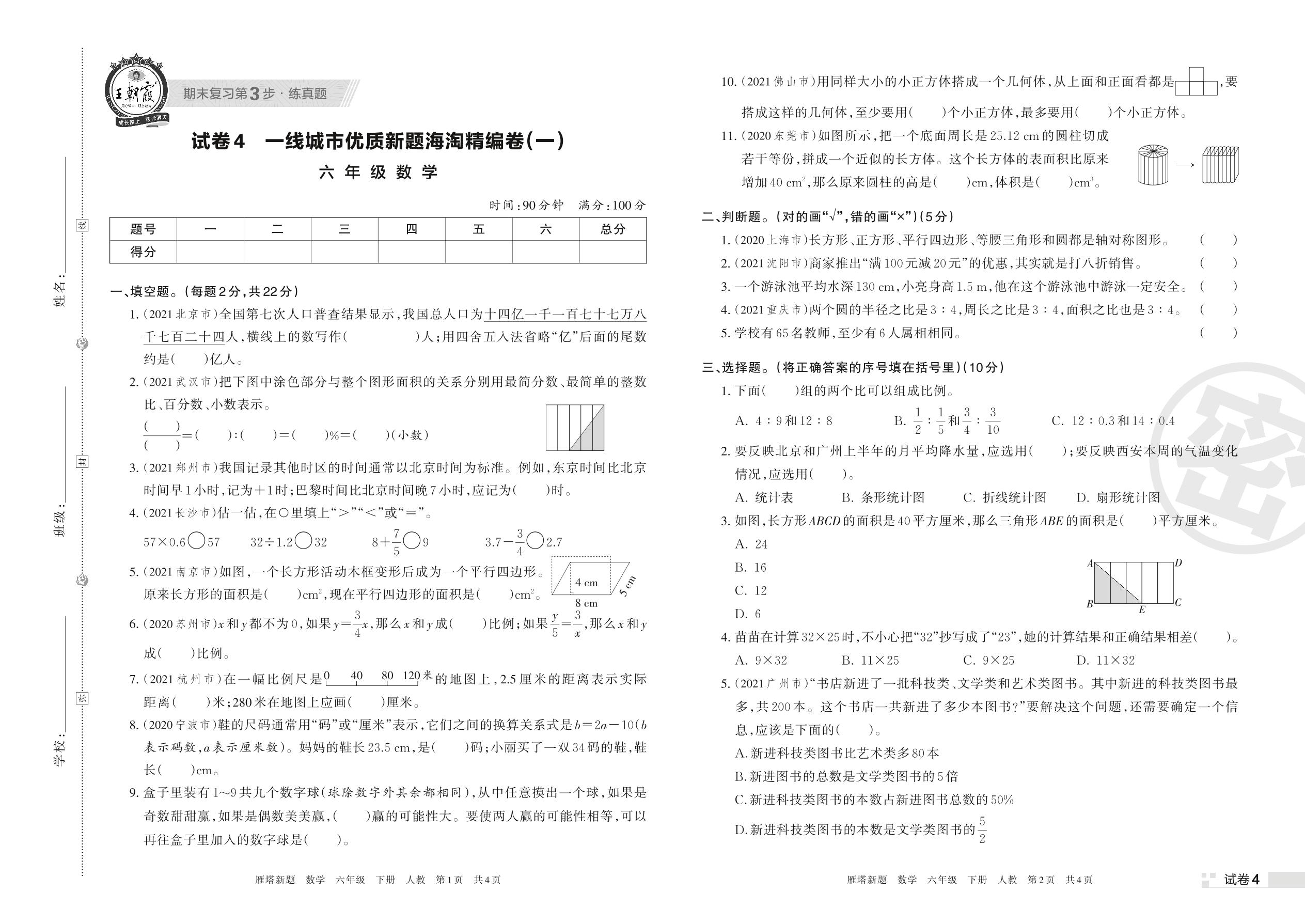 一线城市优质新题海淘精编卷(一)六年级下册数学(人教版)【4】