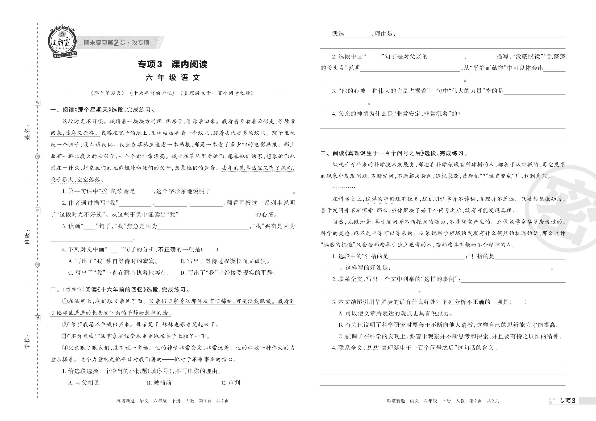 王朝霞期末专项卷——课内阅读六年级下册语文(人教版)_R220330092351941【3】