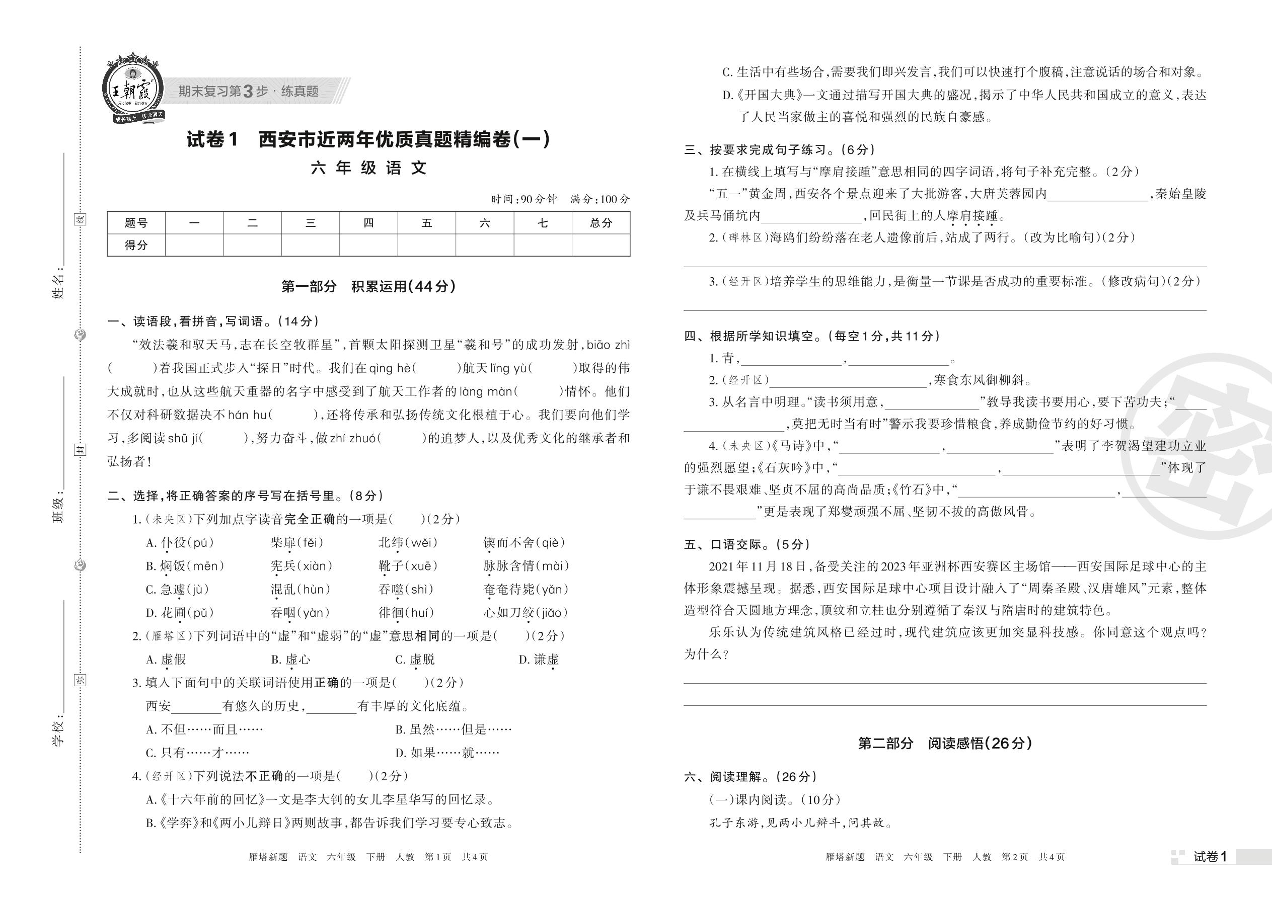 西安市近两年优质真题精编卷(一)六年级下册语文(人教版)【1】