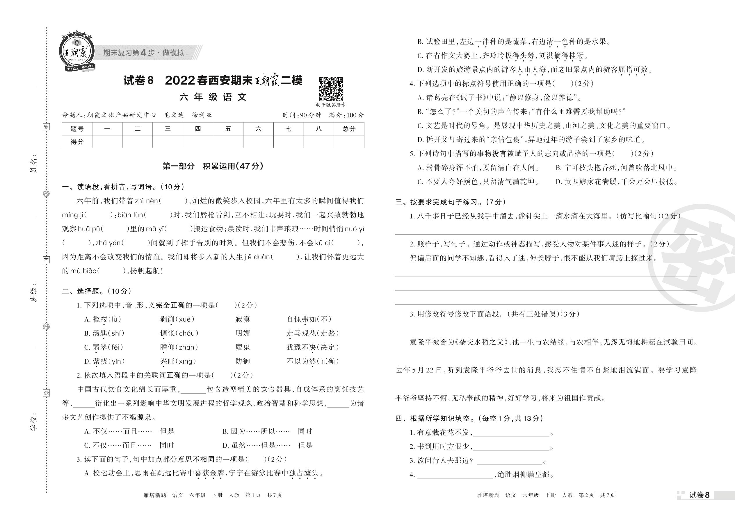 王朝霞期末模拟卷六年级下册语文(人教版)_R220330092352721【8】