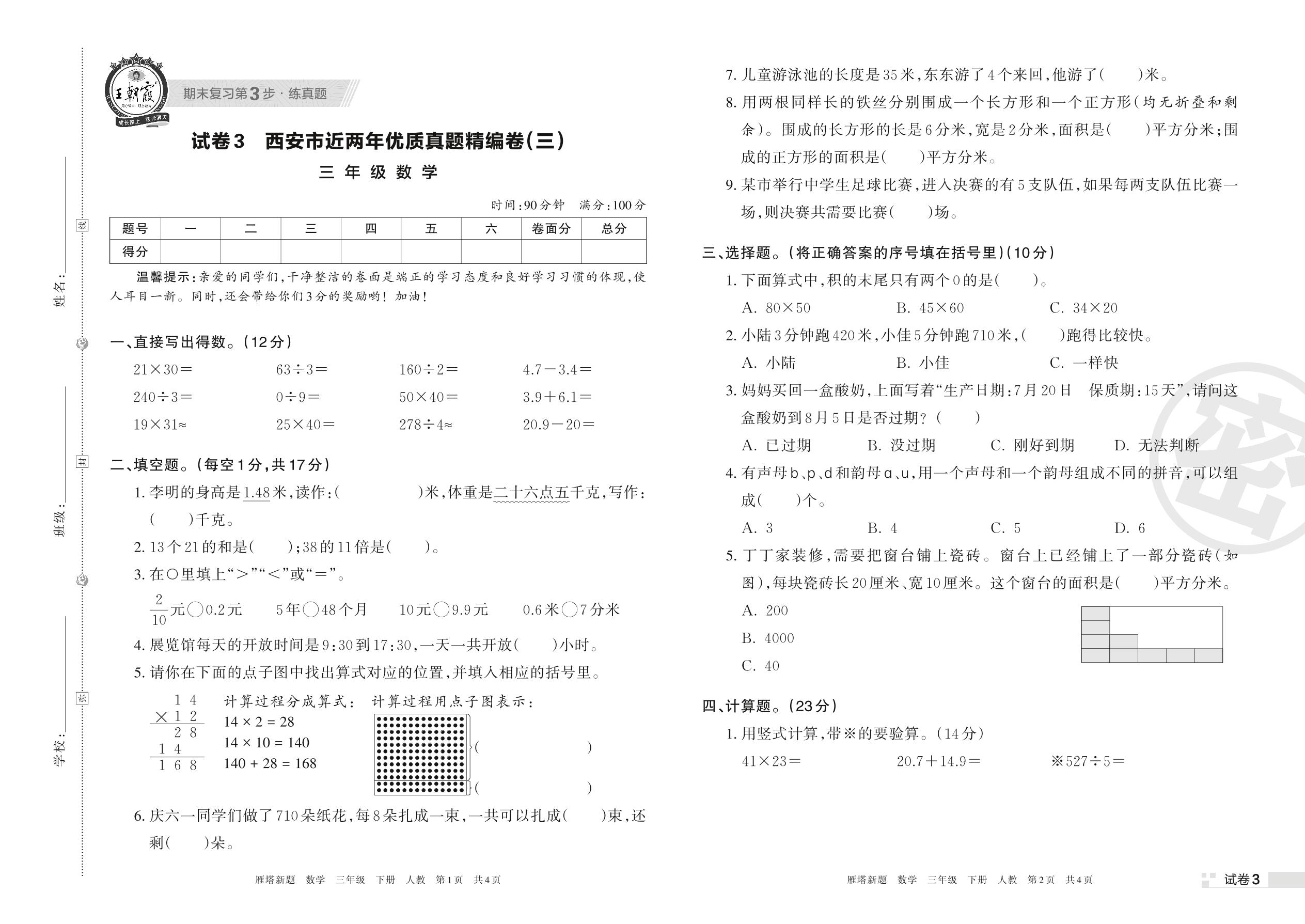 西安市近两年优质真题精编卷(三)三年级下册数学(人教版)【3】