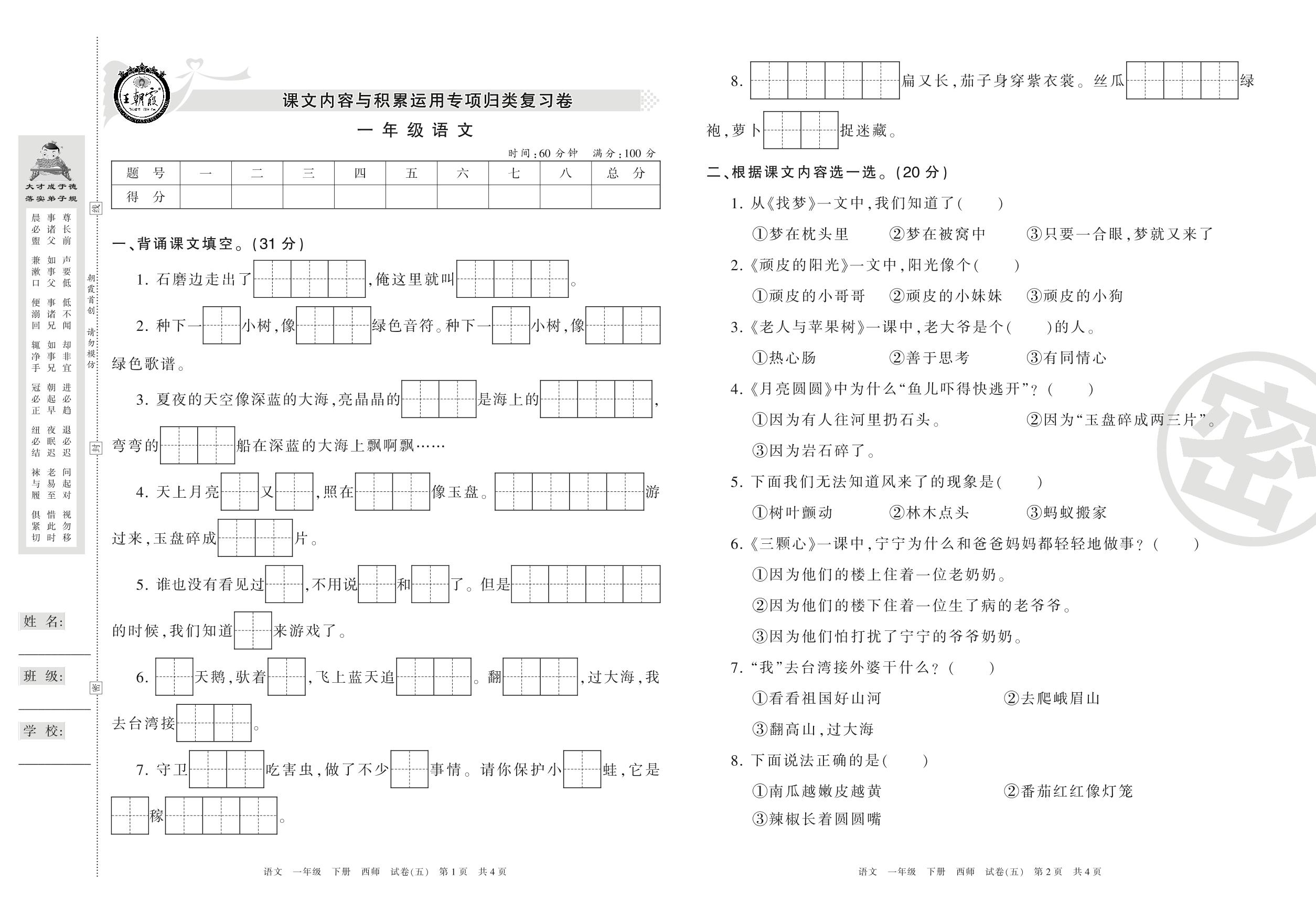 王朝霞期末专项卷一年级下册语文(西师版)【5】