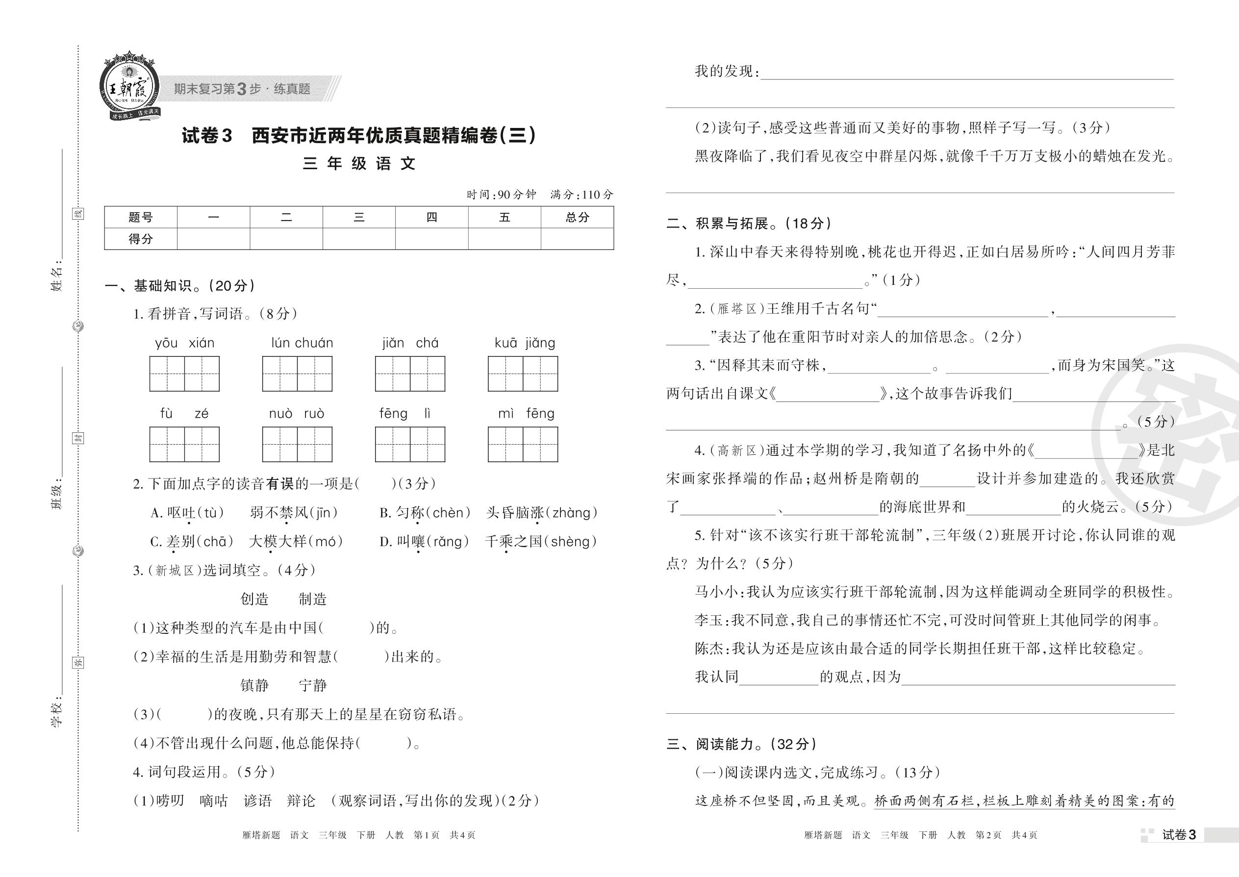 西安市近两年优质真题精编卷(三)三年级下册语文(人教版)【3】