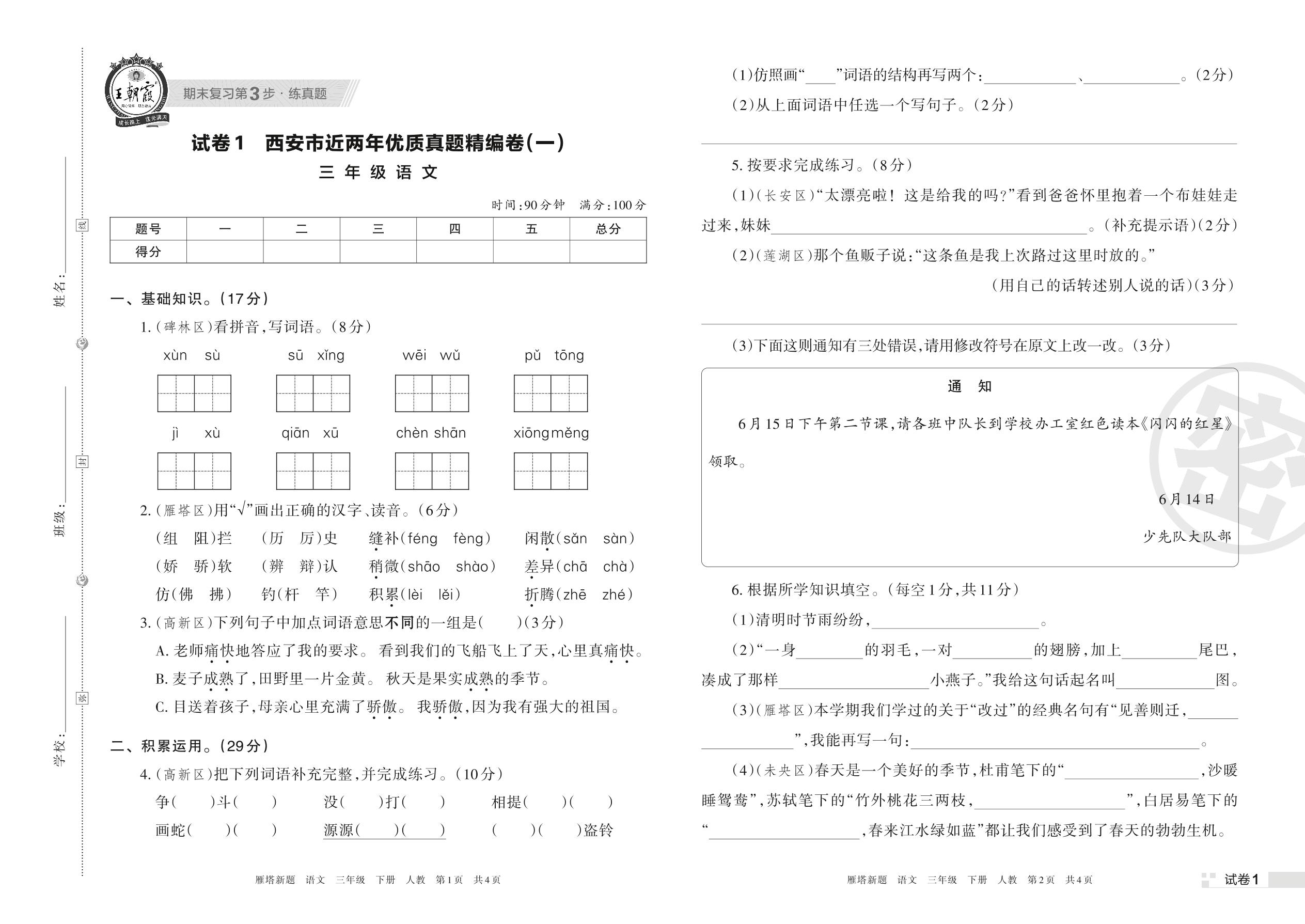 西安市近两年优质真题精编卷(一)三年级下册语文(人教版)【1】