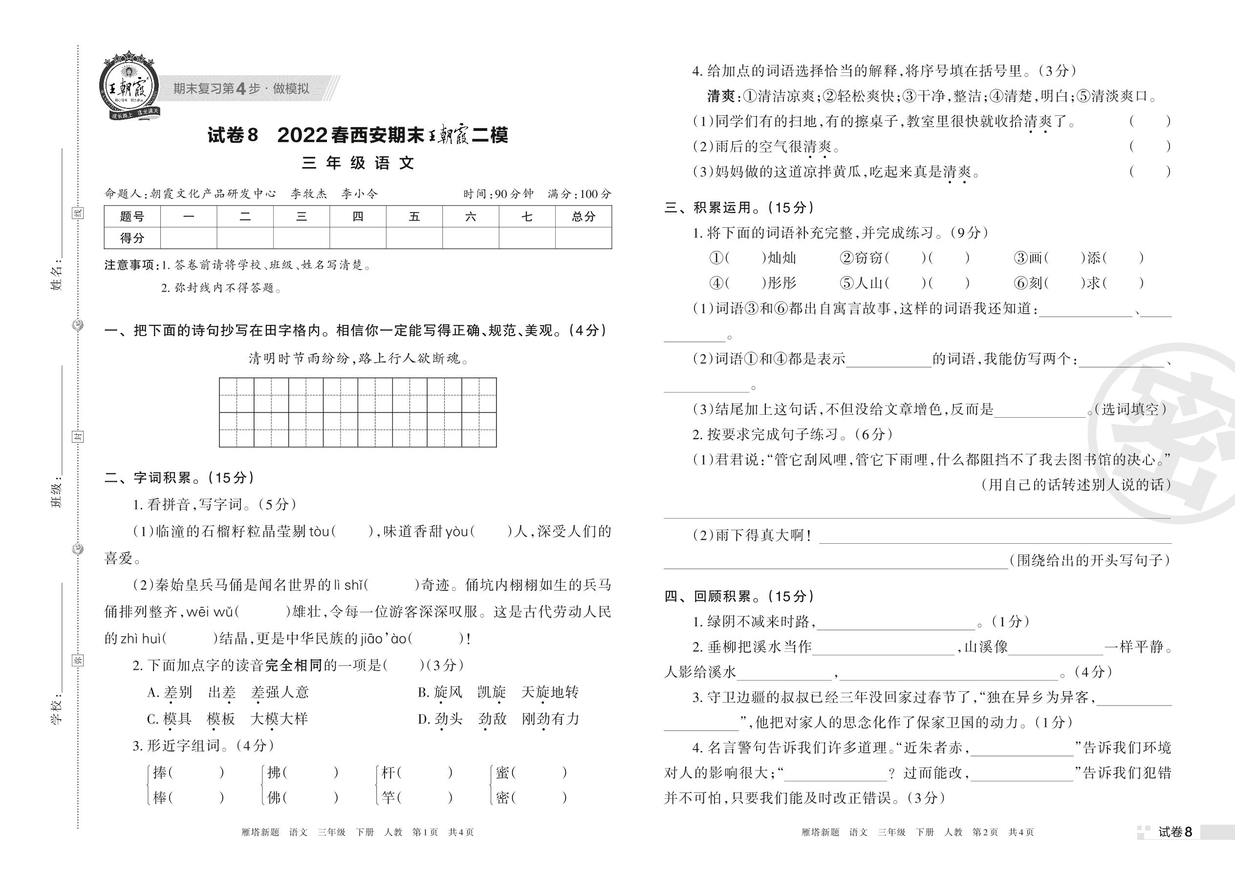 王朝霞期末模拟卷三年级下册语文(人教版)_R220330102459780【8】