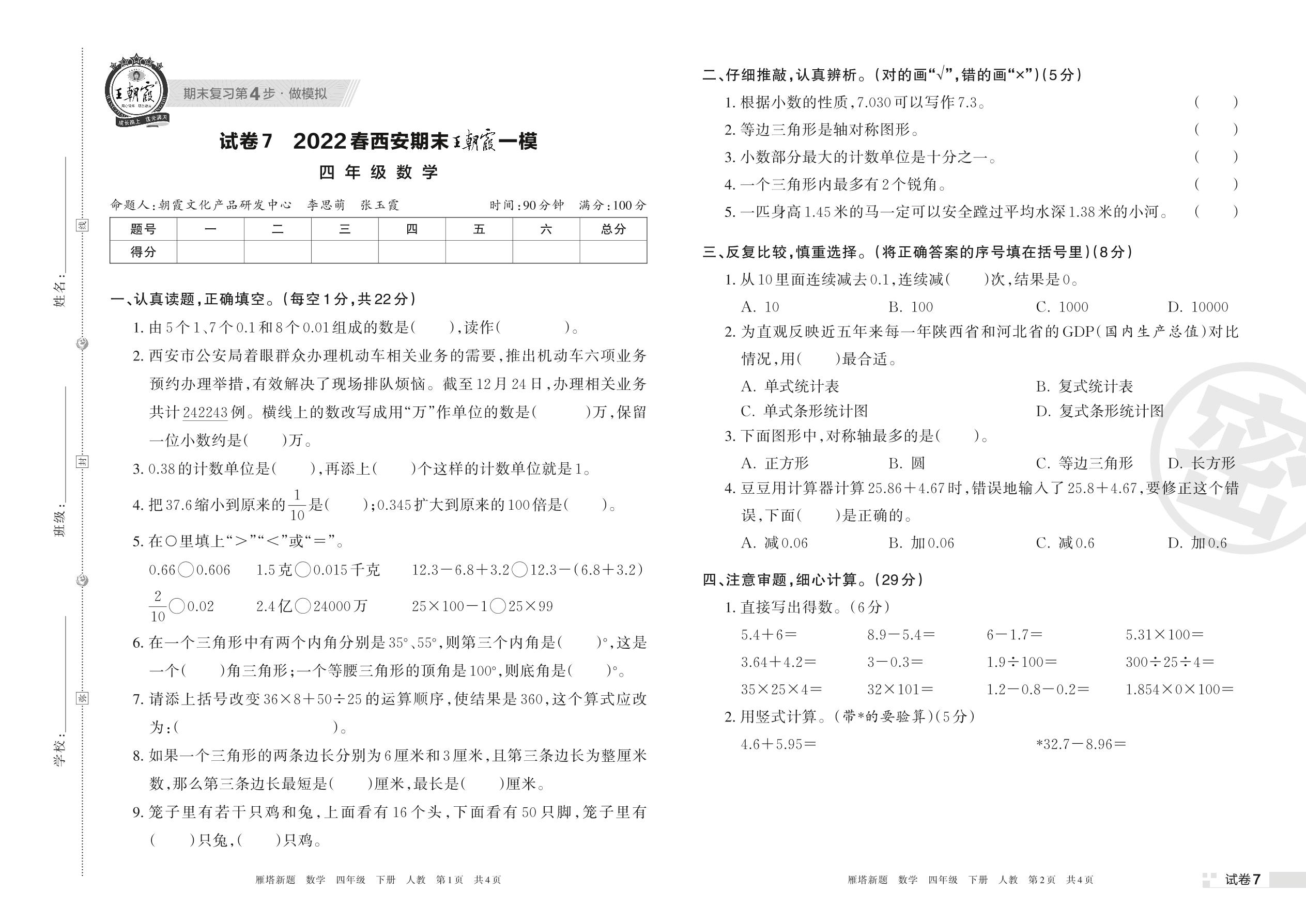 王朝霞期末模拟卷四年级下册数学(人教版)_R220330104016191【7】