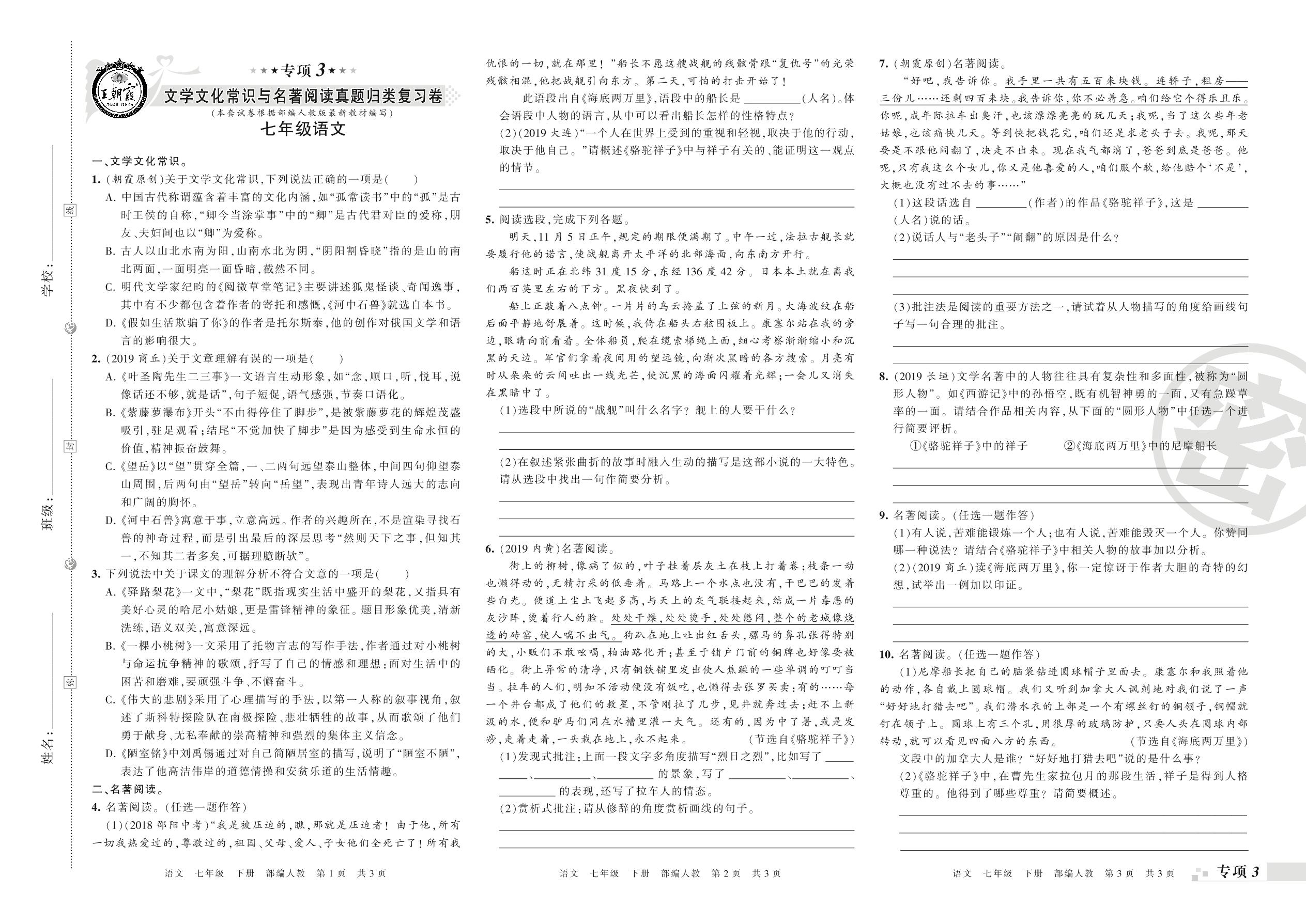 王朝霞期末专项卷——文学文化常识与名著阅读、综合性学习真题归类复习卷七年级下册语文(人教版)_R21080215538【0】