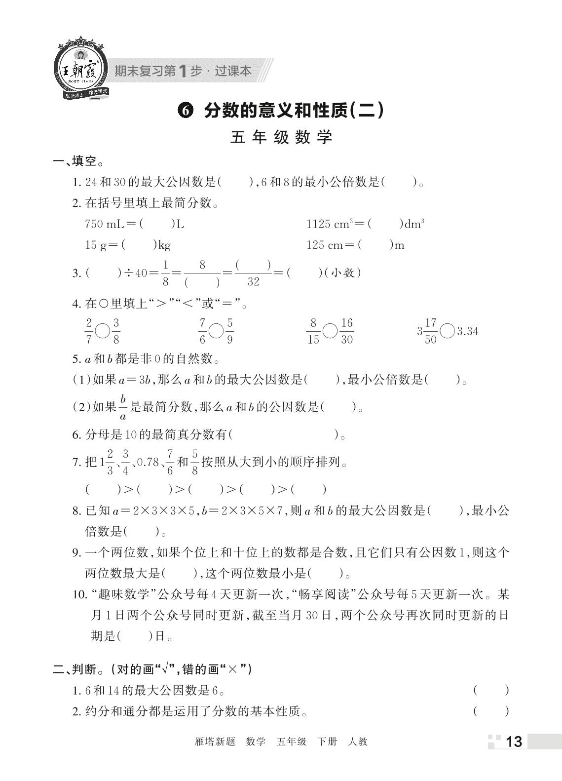 王朝霞期末过课本——6 分数的意义和性质(二)五年级下册数学(人教版)_R220330105200944