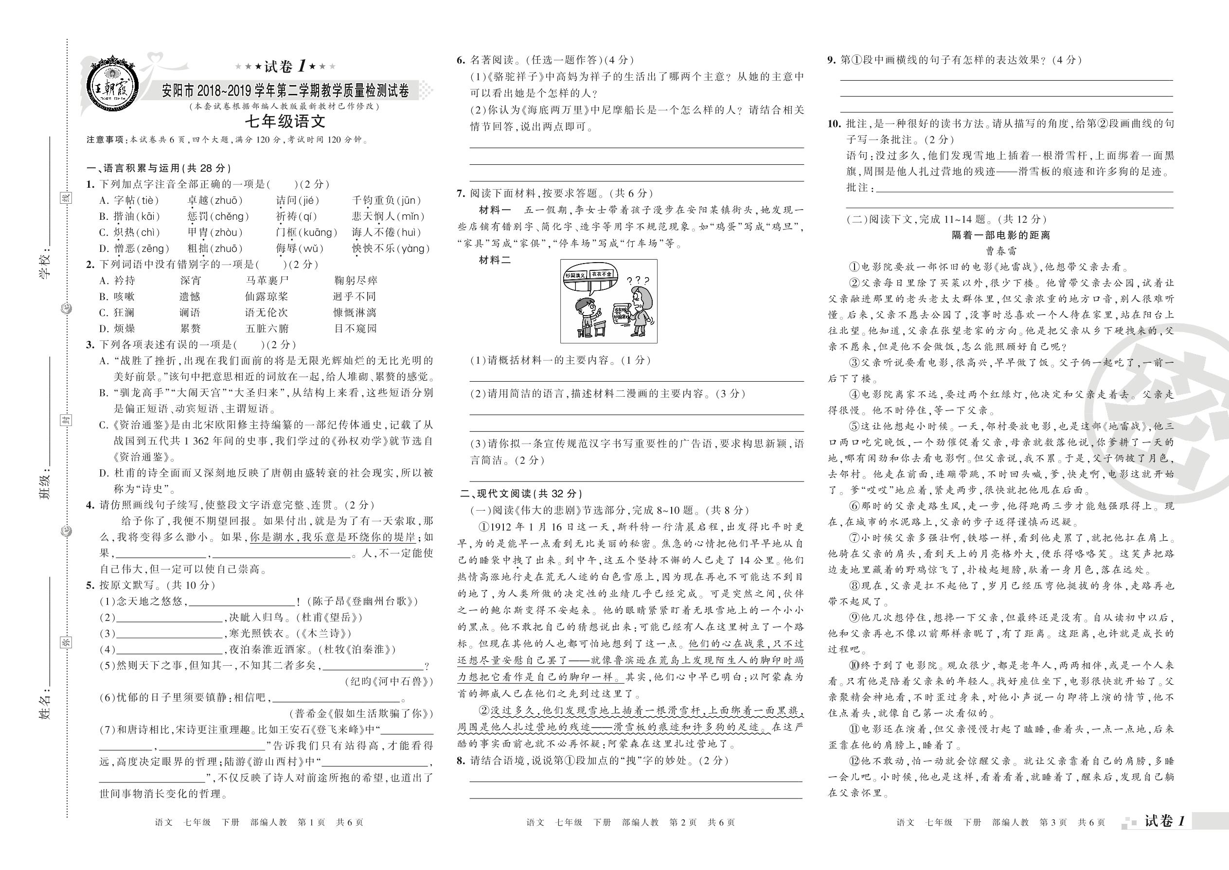 2018-2019学年第二学期安阳市七年级语文试卷(人教版)【1】