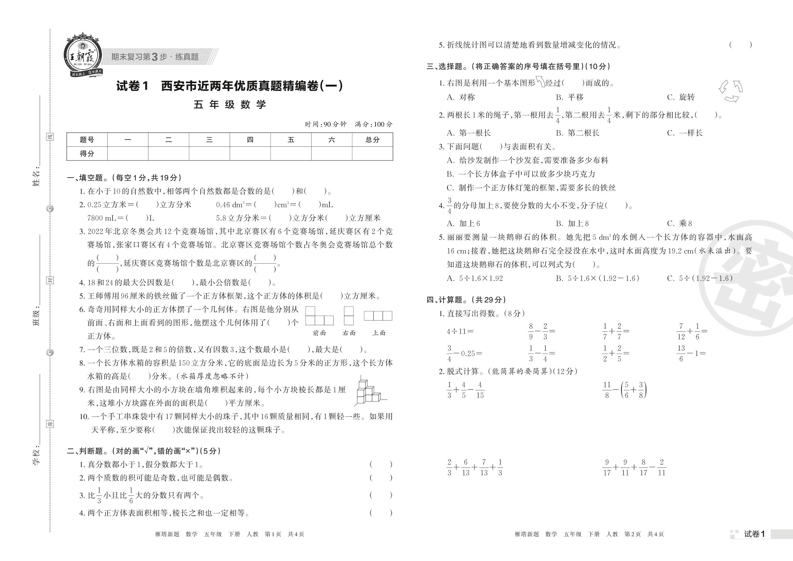 西安市近两年优质真题精编卷(一)五年级下册数学(人教版)【1】