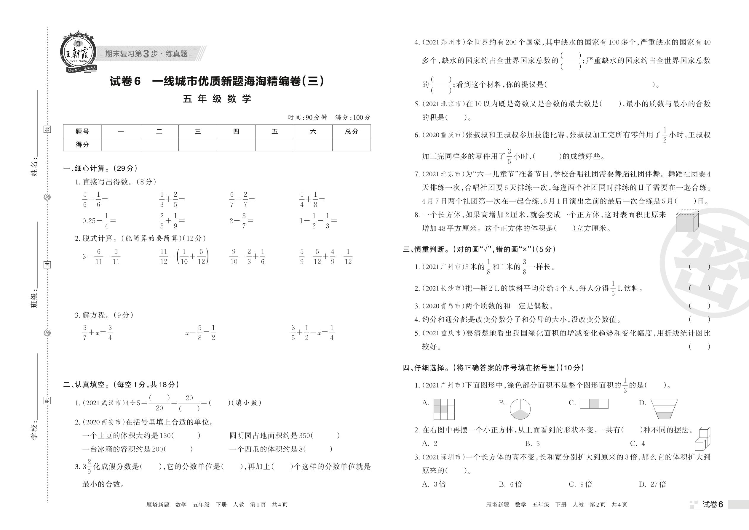 一线城市优质新题海淘精编卷(三)五年级下册数学(人教版)【6】