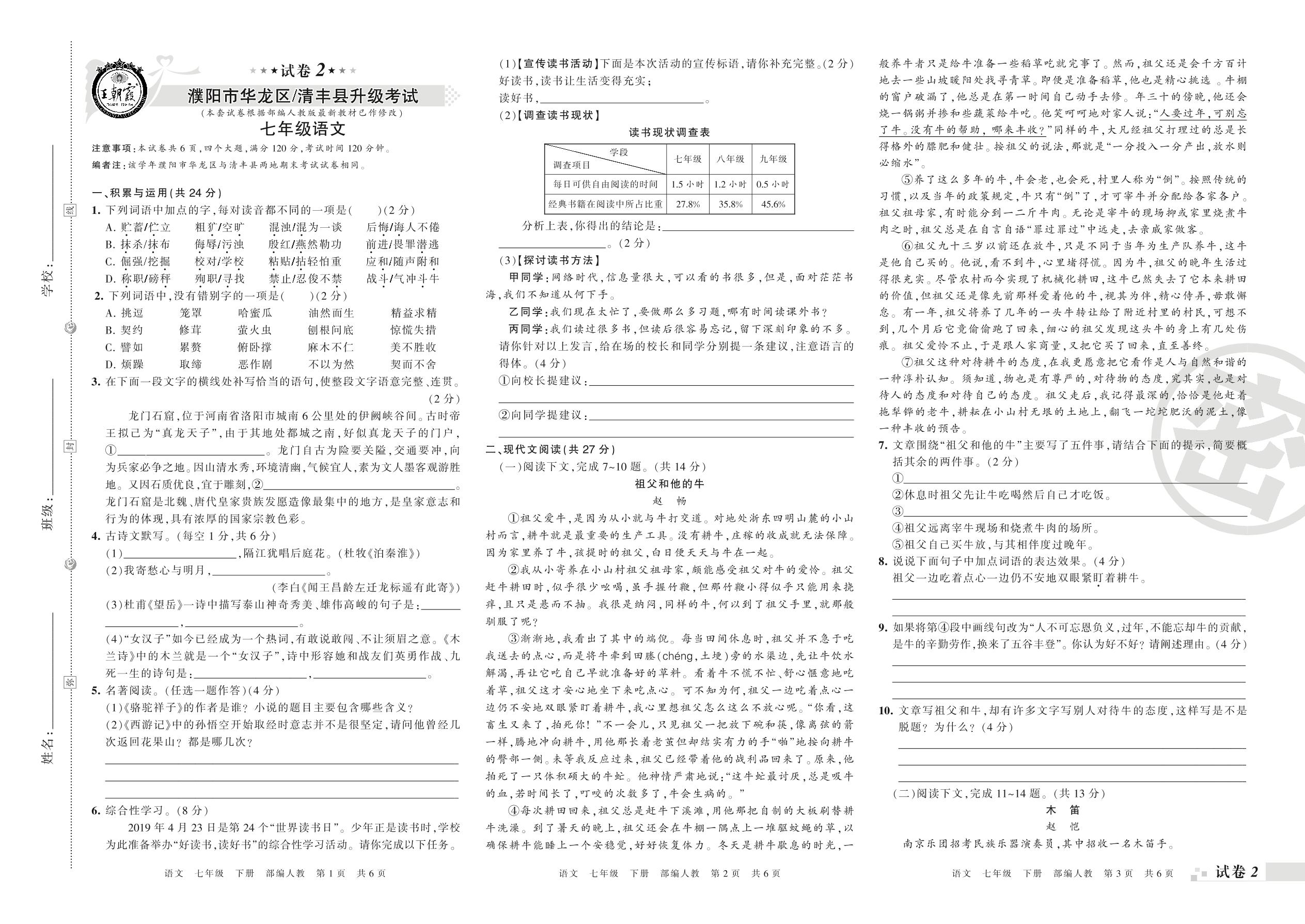 2018-2019学年第二学期濮阳市华龙区、清丰县七年级语文试卷(人教版)【2】