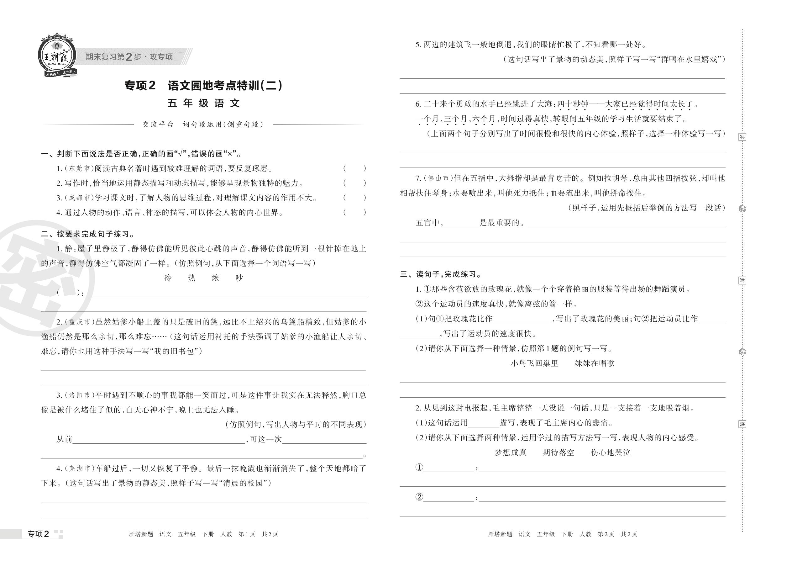 王朝霞期末专项卷——语文园地考点特训(二)五年级下册语文(人教版)_R220330105831742【2】