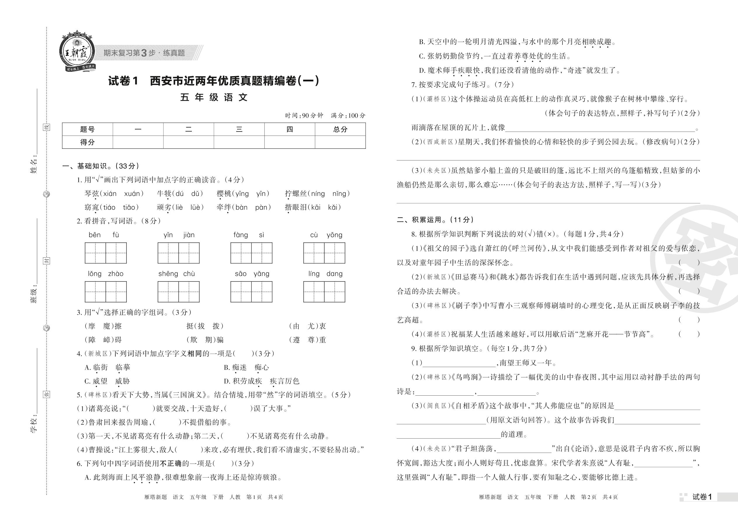 西安市近两年优质真题精编卷(一)五年级下册语文(人教版)【1】