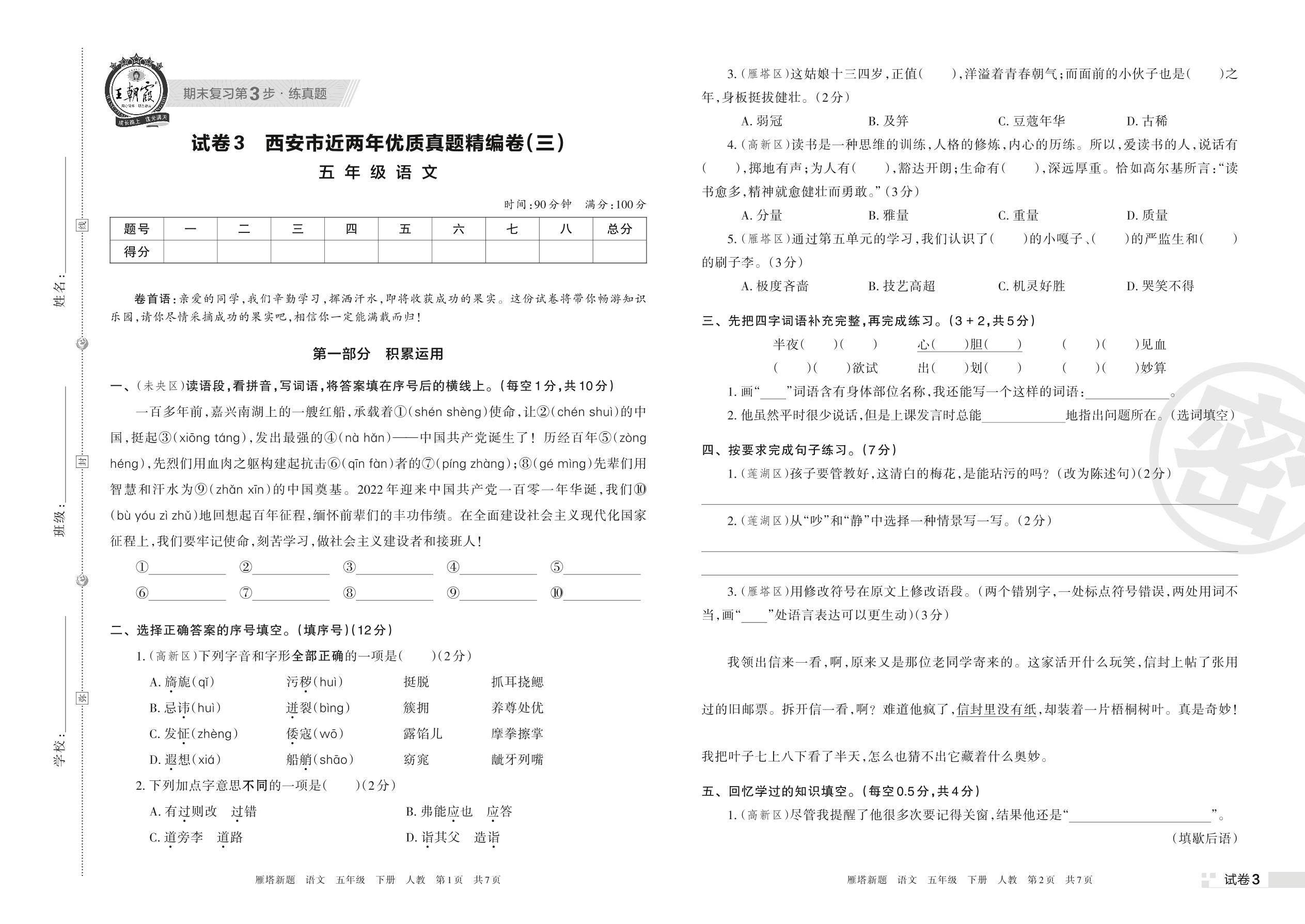 西安市近两年优质真题精编卷(三)五年级下册语文(人教版)【3】