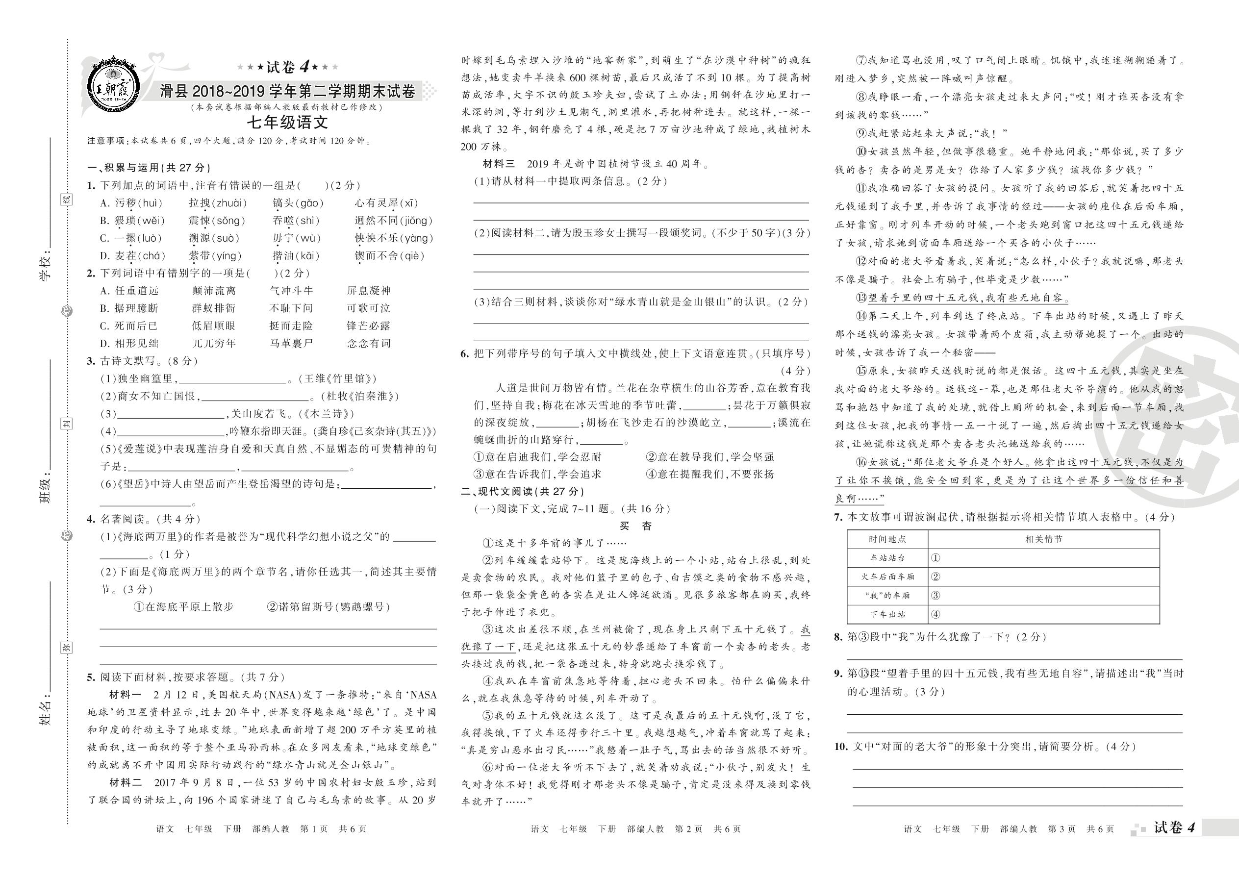 2018-2019学年第二学期安阳市滑县七年级语文试卷(人教版)【4】