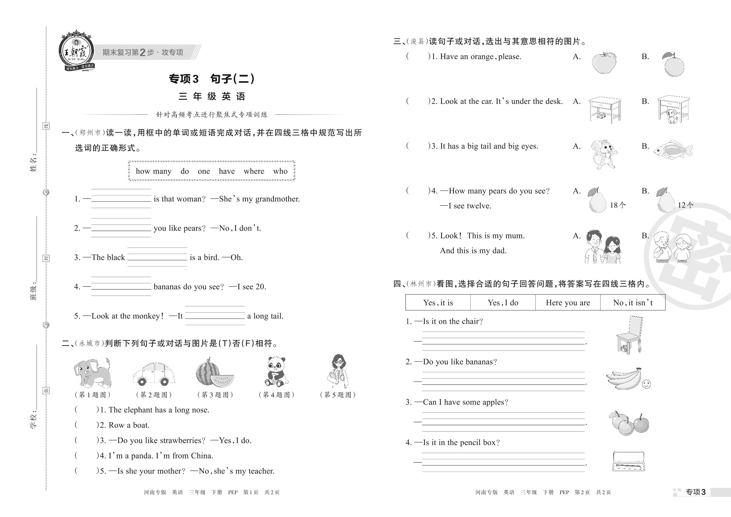 王朝霞期末专项卷——句子(二)三年级下册英语(PEP版)_R220331094940366【3】