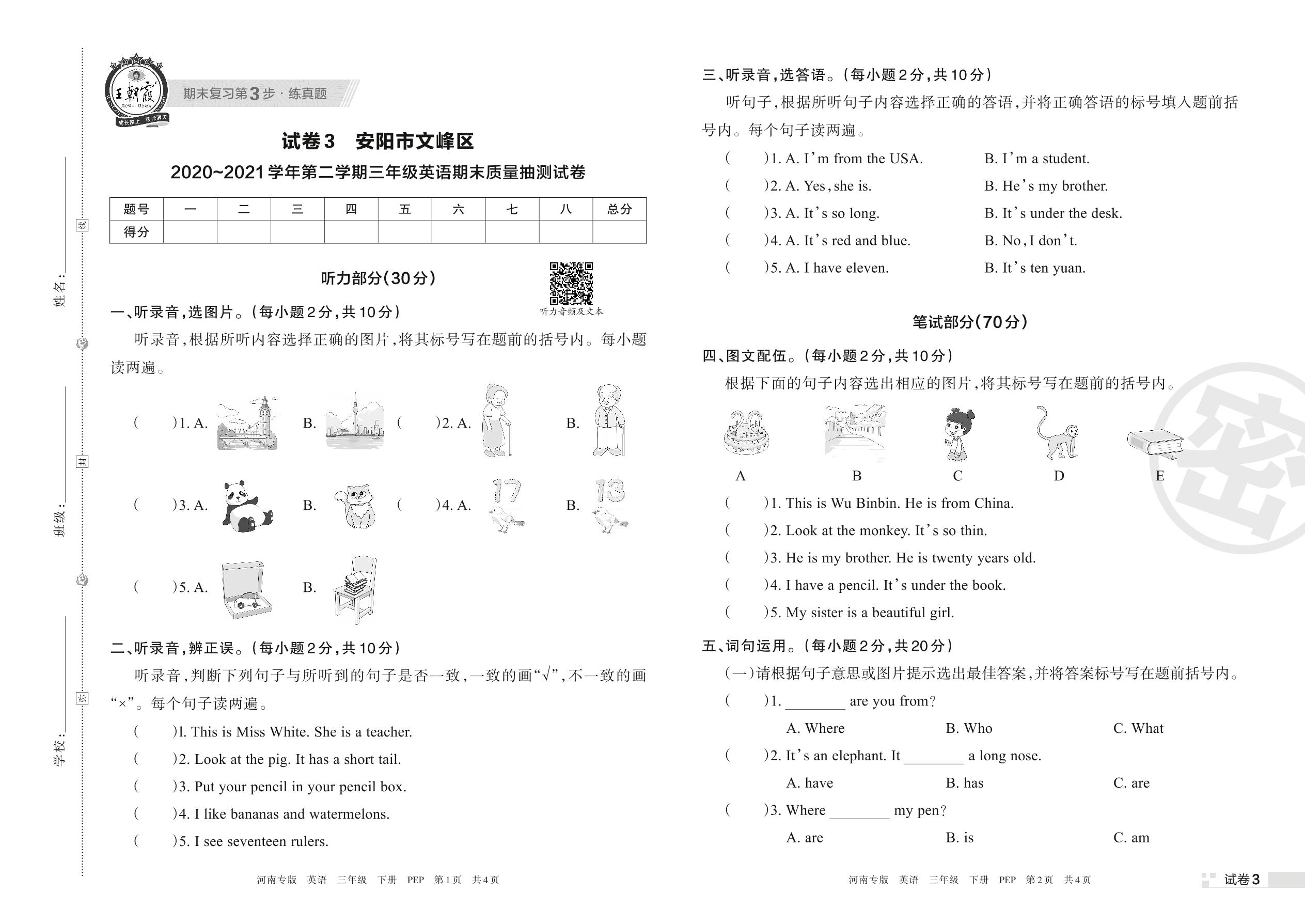 安阳市文峰区2020~2021学年第二学期三年级英语期末质量抽测试卷(PEP版)【3】