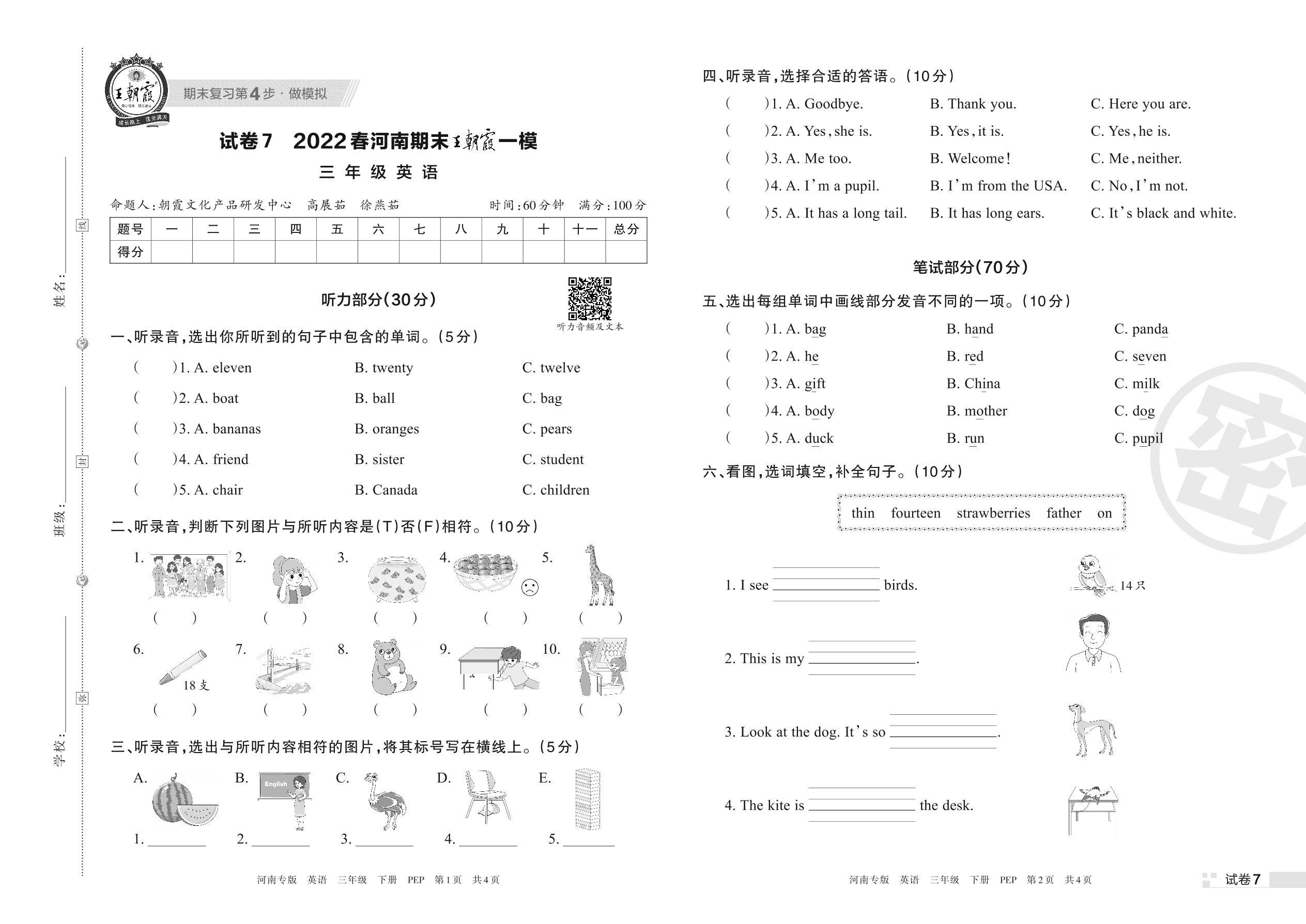 王朝霞期末模拟卷三年级下册英语(PEP版)_R220331094941156【7】