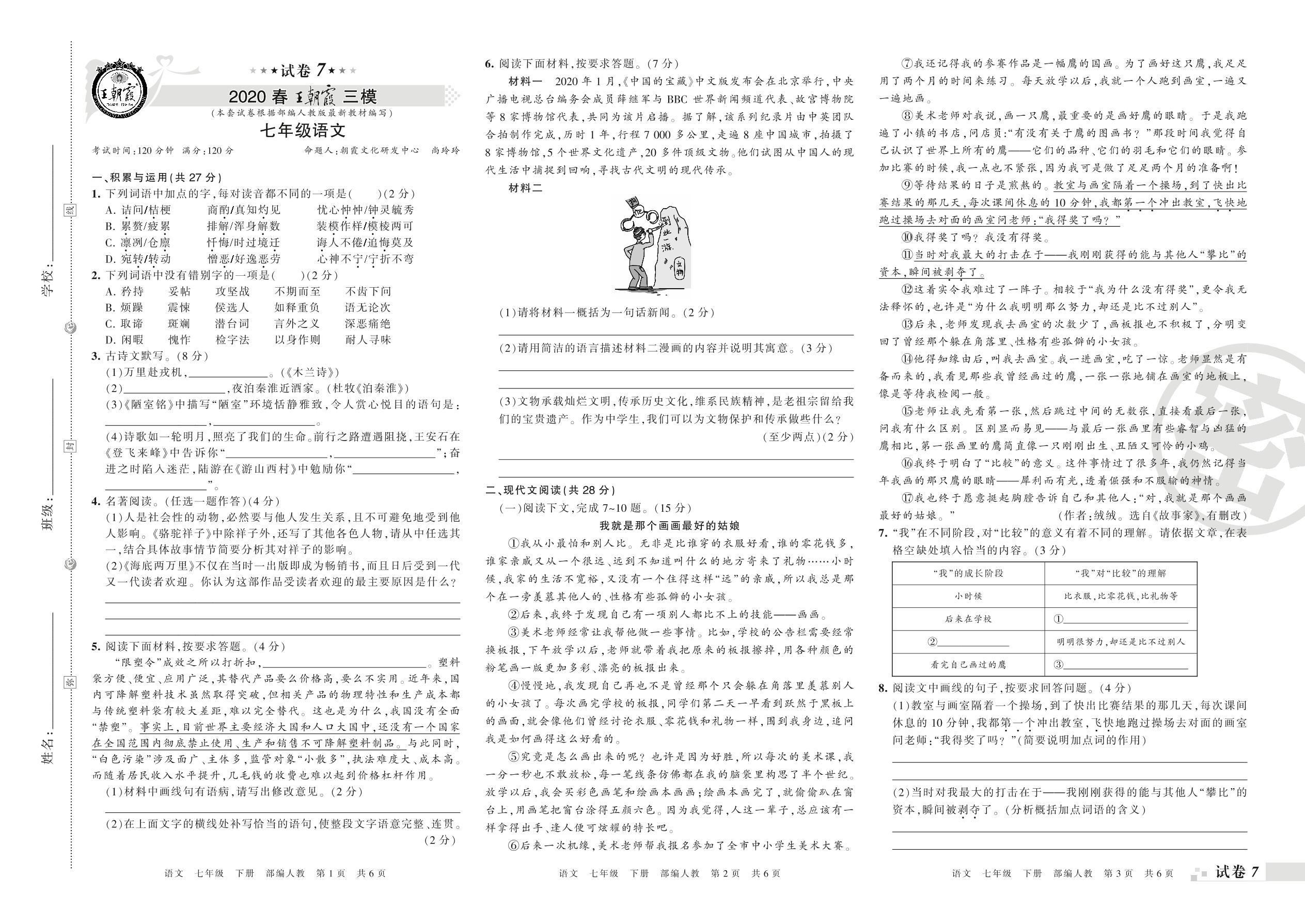 王朝霞期末模拟卷七年级下册语文(人教版)_R21080215701【7】
