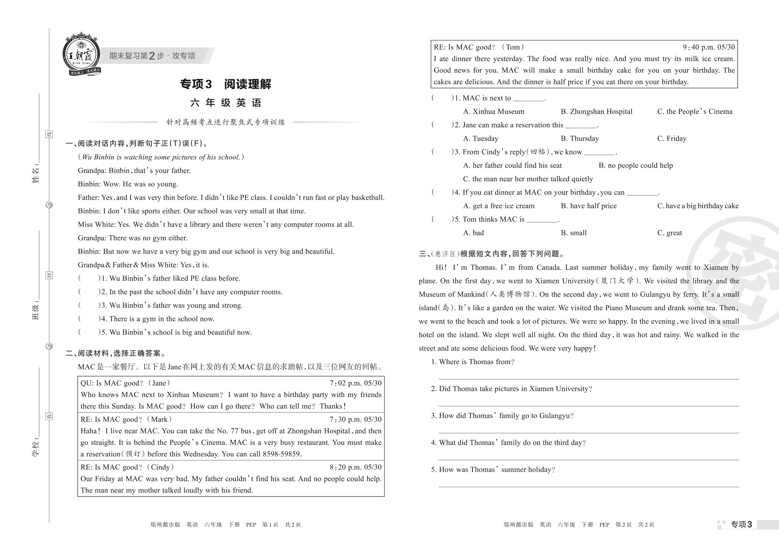 王朝霞期末专项卷——阅读理解六年级下册英语(PEP版)【3】