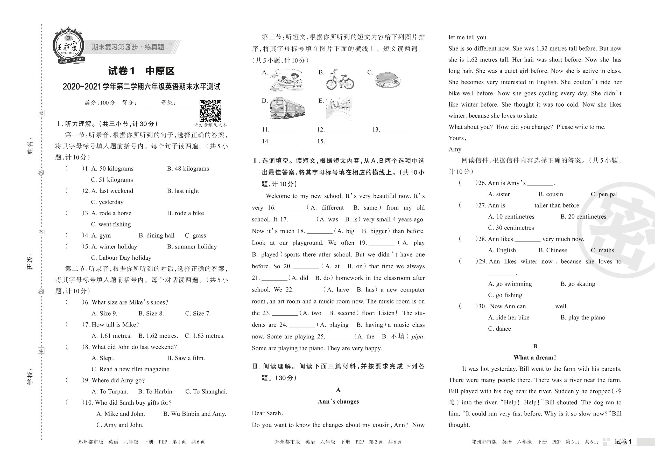 中原区2020~2021学年第二学期六年级英语期末水平测试(PEP版)【1】