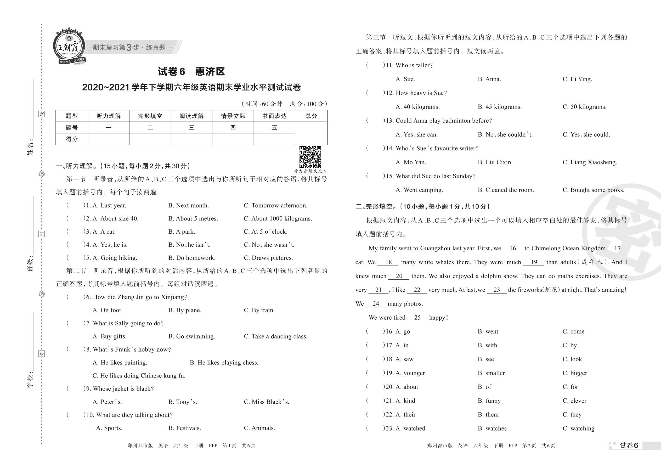 惠济区2020~2021学年下学期六年级英语期末学业水平测试试卷(PEP版)【6】