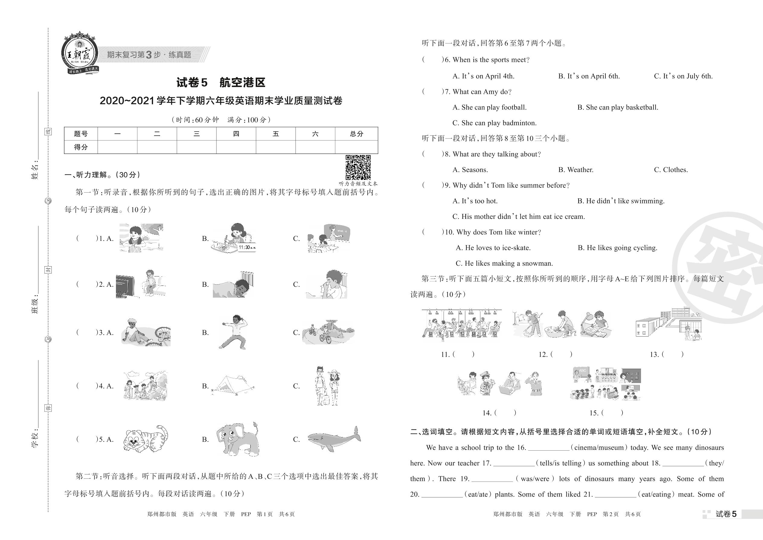 航空港区2020~2021学年下学期六年级英语期末学业质量测试卷(PEP版)【5】