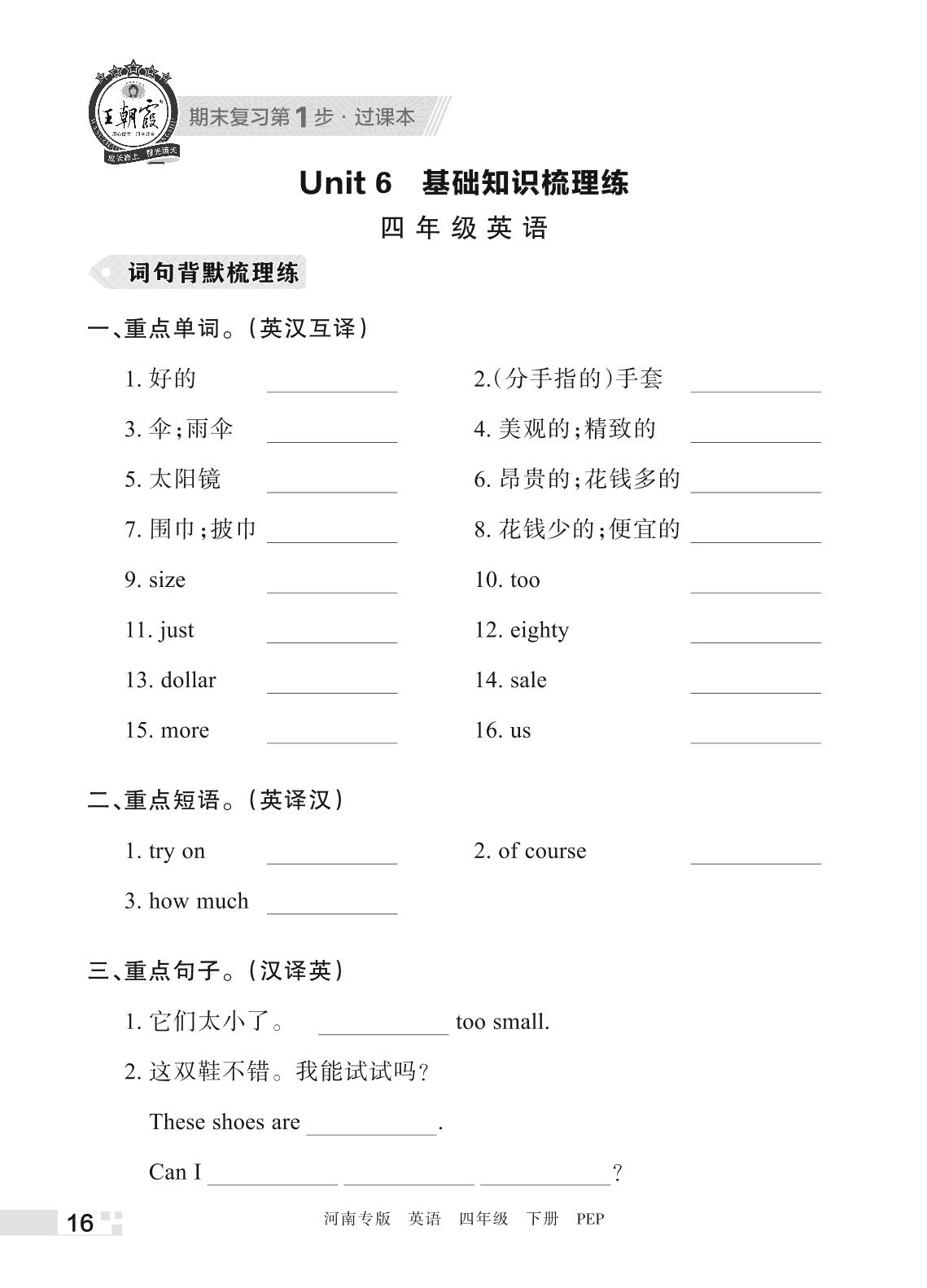 王朝霞期末过课本——Unit 6 基础知识梳理练四年级下册英语(PEP版)_R220331095525921