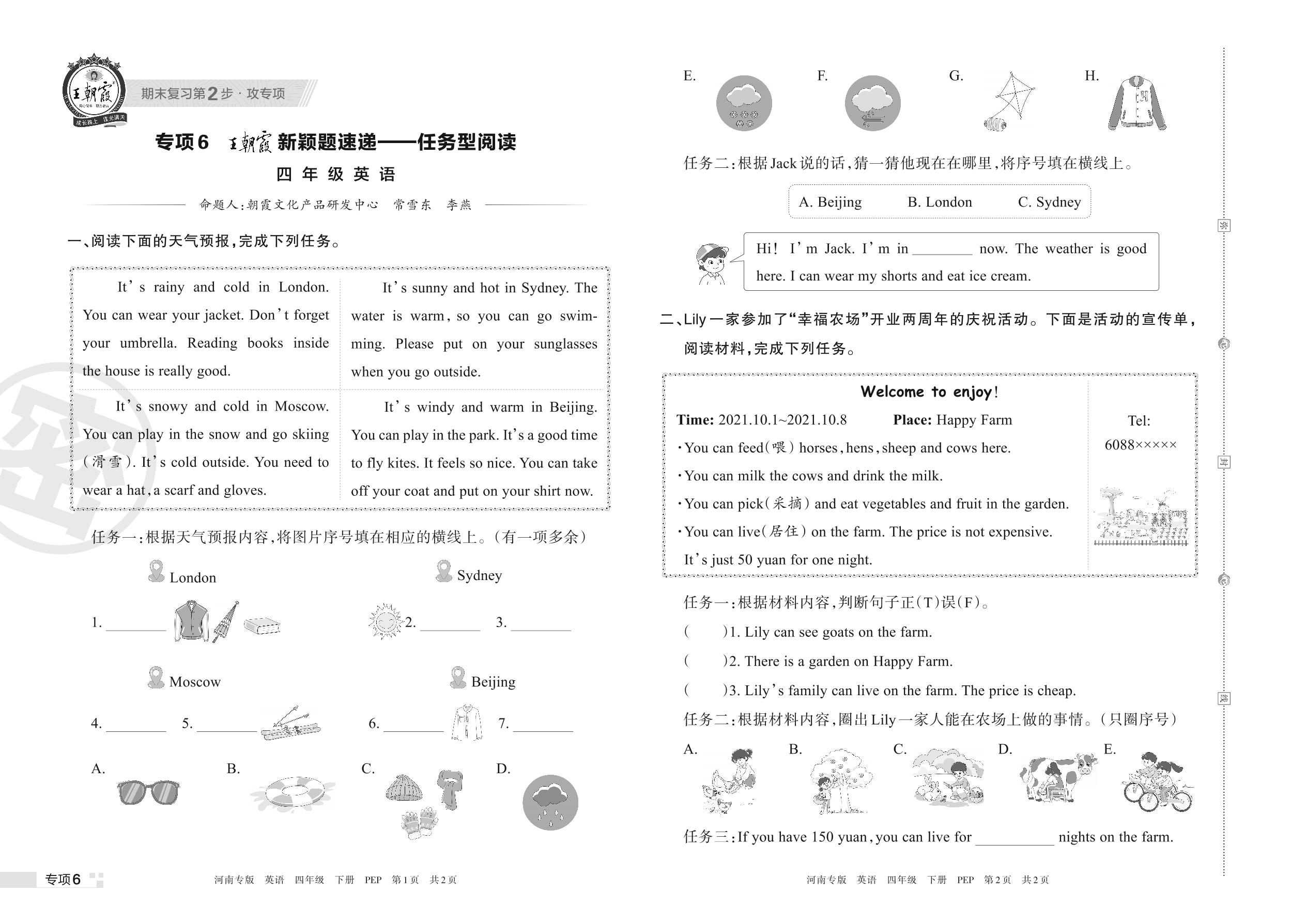 王朝霞期末专项卷——新颖题速递:任务型阅读四年级下册英语(PEP版)_R220331095526853【6】