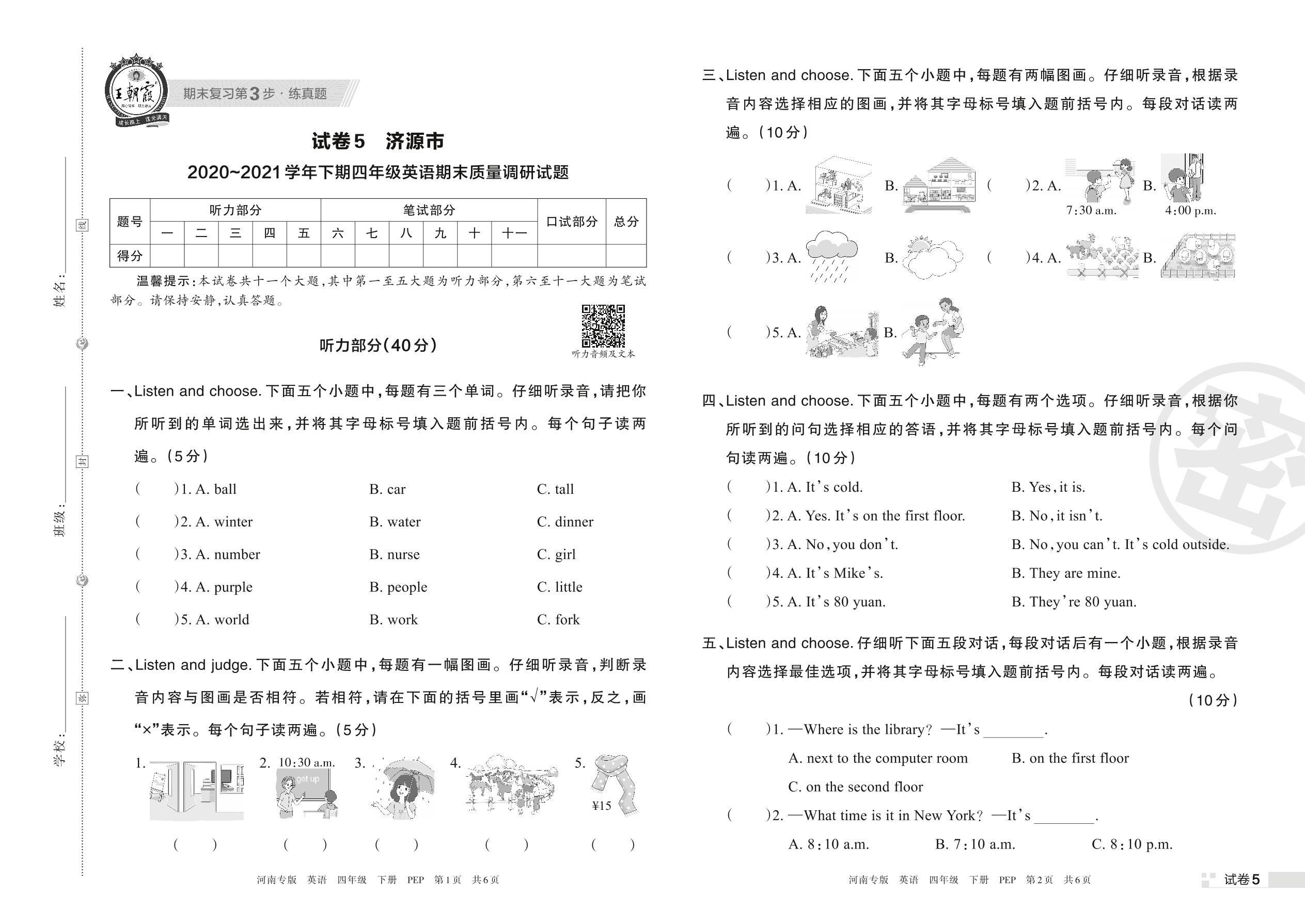 济源市2020~2021学年下期四年级英语期末质量调研试题(PEP版)【5】