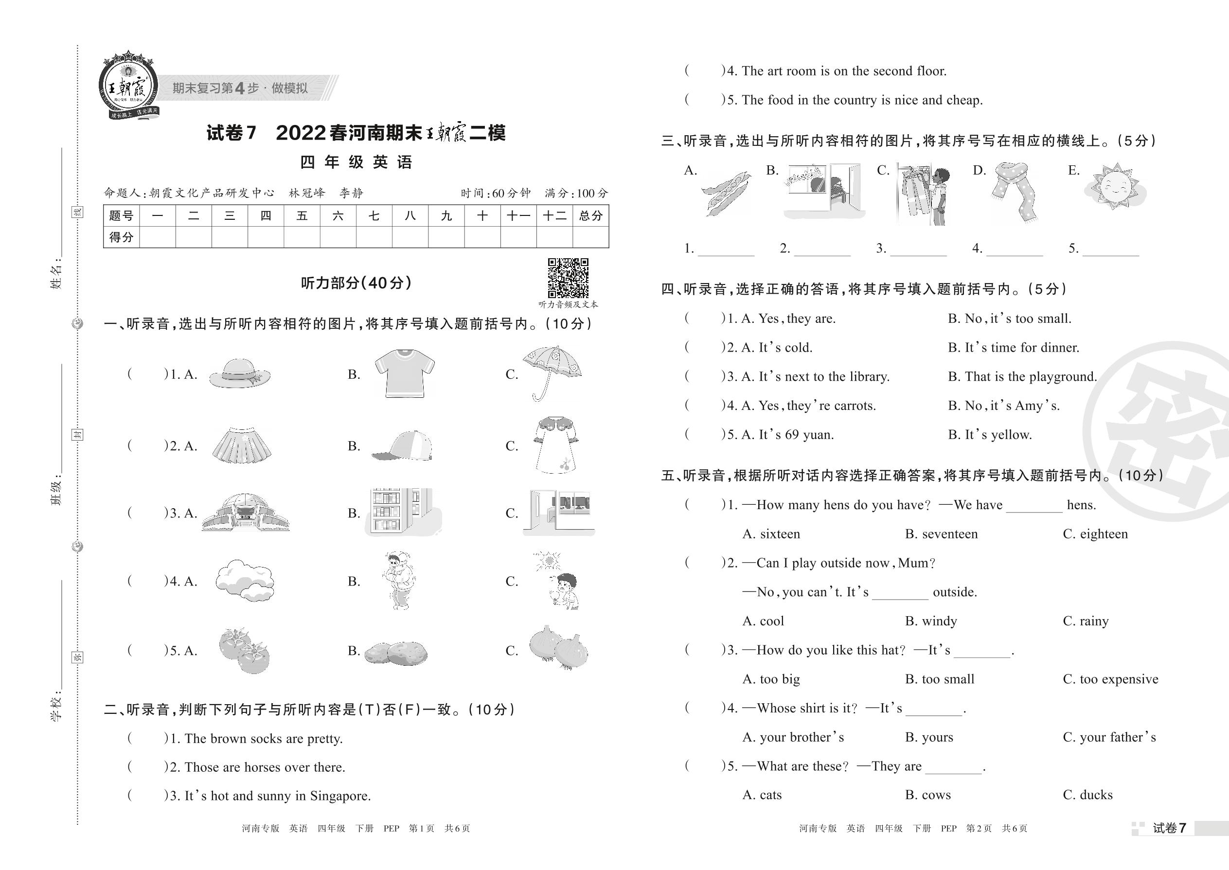 王朝霞期末模拟卷四年级下册英语(PEP版)_R220331095527012【7】